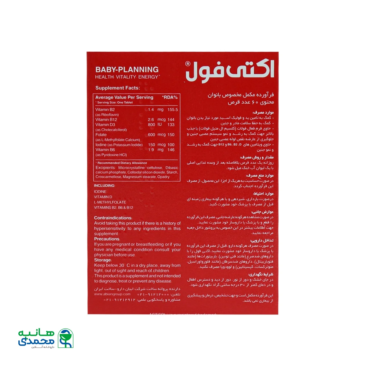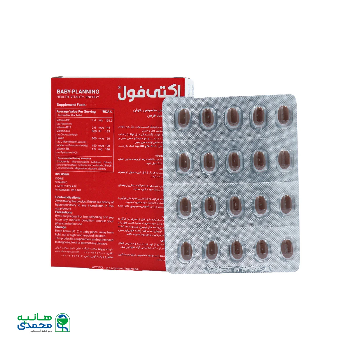 قرص اکتی فول ابیان دارو مکملی هدفمند برای دوران پیش از بارداری، بارداری و شیردهی است که با ترکیبات دقیق حاوی ویتامین B12، B6، B9، فولات، ویتامین د3 و ید طراحی شده است. این مکمل به طور ویژه به تأمین نیاز روزانه فولیک اسید و ید کمک میکند و در نتیجه نقش مثبتی در سلامت مادر و جنین ایفا میکند. در این محصول از فرم فعال فولات با جذب بالاتر استفاده شده است که جذب راحتتری نسبت به فرم معمول فولات دارد. قرص اکتی فول در 3 بلیستر 20 عددی در جعبه مقوایی توسط شرکت ایرانی ابیان دارو تولید و بسته بندی میشود. با این تفاسیر میتوان گفت اکتی فول انتخابی علمی و قابل اتکا برای خانمهایی است که میخواهند با یک مکمل، مراقبت تغذیهای این دوران را کامل کنند. در کنار مصرف قرص اکتی فول در دوران بارداری، بهتر است به سلامت پوست خود اهمیت دهید؛ از این رو برای جلوگیری از ایجاد ترکهای پوستی روی شکم و پهلوها، اقدام به خرید کرم ضد ترک و استفاده از آن نمایید.