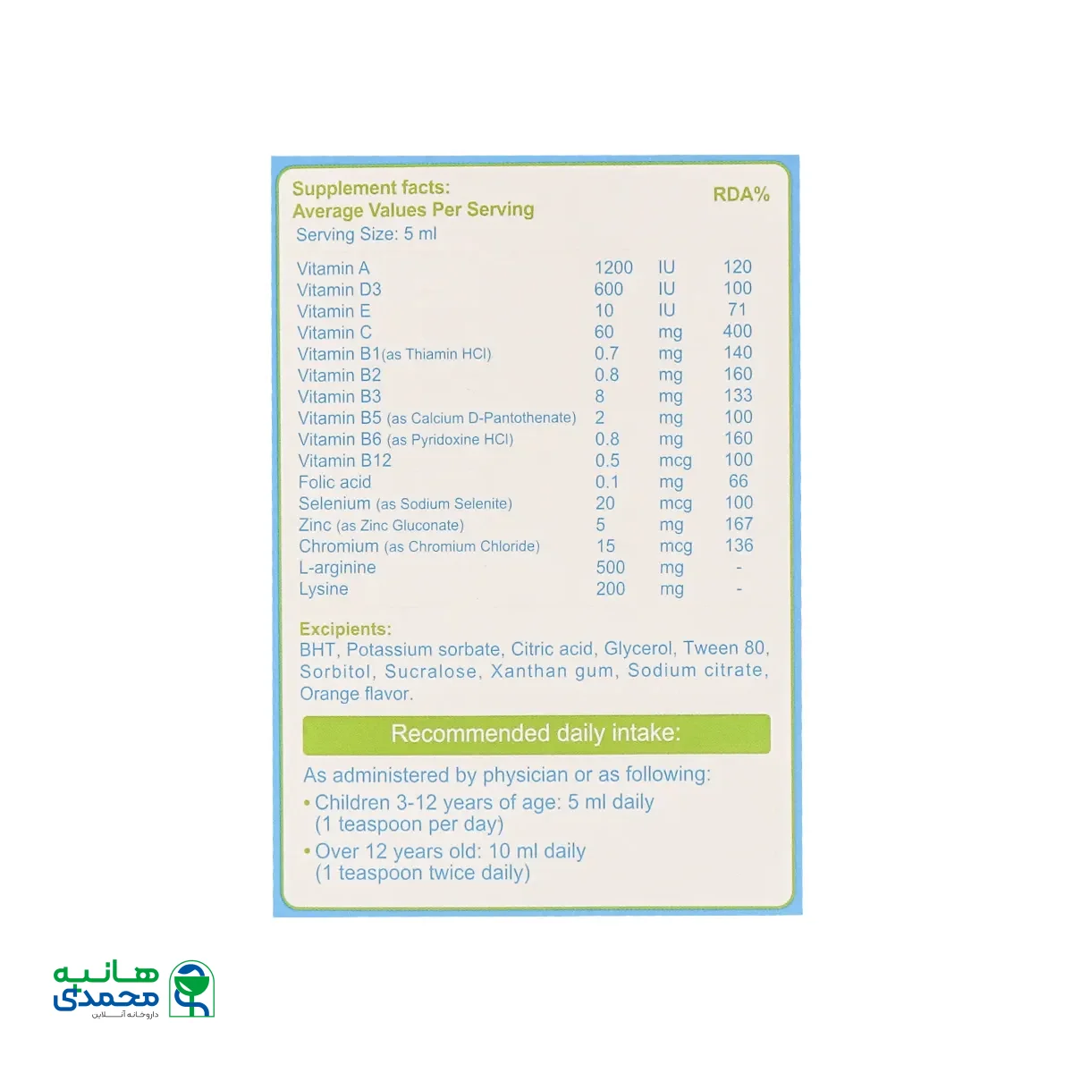 • محدوده سنی 12-3 سال: 5 میلی لیتر روزانه (یک قاشق مرباخوری یک بار در روز)