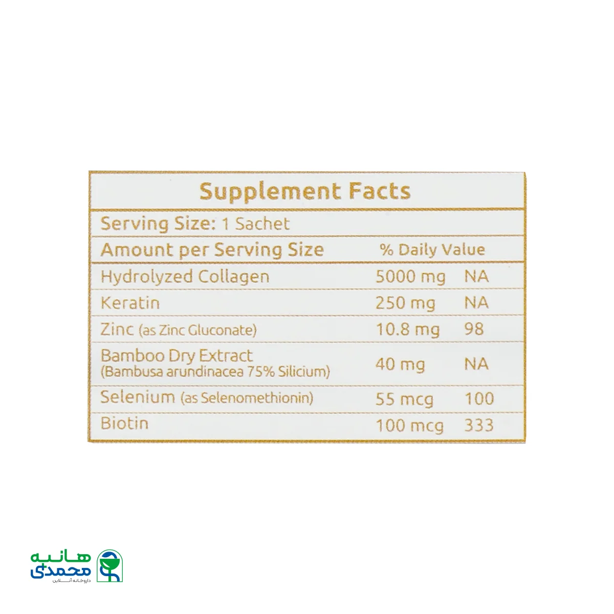 ساشه کلاژن گلد مو و ناخن آدریان یک مکمل تخصصی و ویژه برای پوست، مو و ناخن به شمار می‌آید. با مصرف ساشه کلاژن گلد مو و ناخن آدریان دیگر شما نیازی به مصرف جداگانه کلاژن ندارید، زیرا به تنهایی قادر است مقادیر بالایی از کلاژن را برای شما تامین کند. در ادامه به بررسی دیگر ترکیبات موجود در این فرآورده می‌پردازیم: