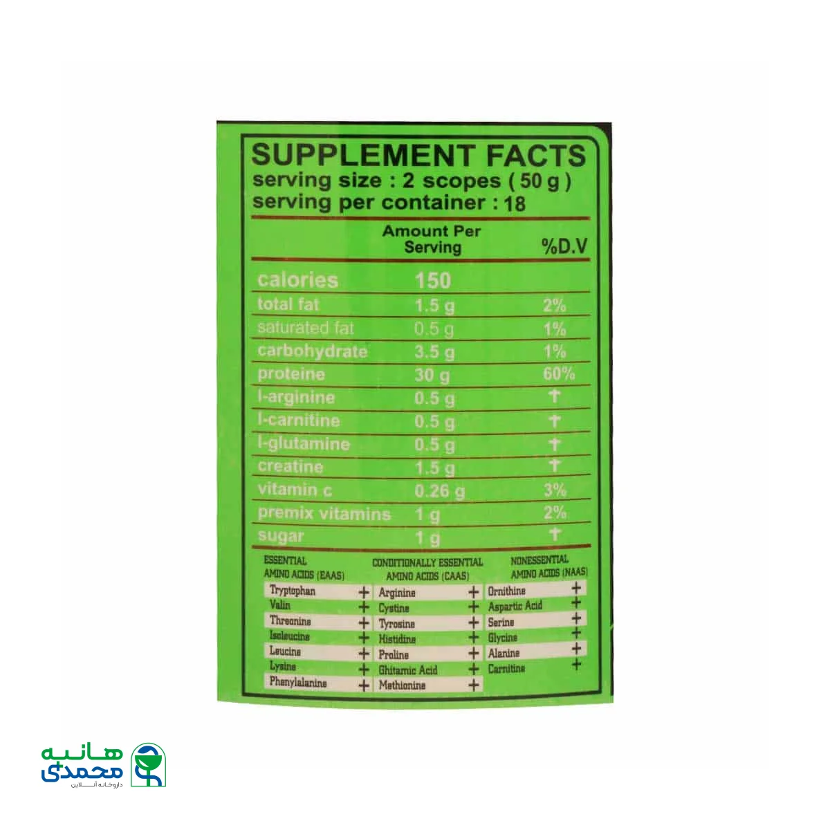 شامل اسیدهای آمینه‌های: تریپ توفان، والین، تروناین، ایزو لوسیون، لوسین، لیزین، فنیل لالانین، آرژنین، سیستئین، تروزین، هیستیدین، پرولاین، چیتامیک اسید، متیونین، آسپارتیک اسید، لیزین، آلانین، کارنیتین.