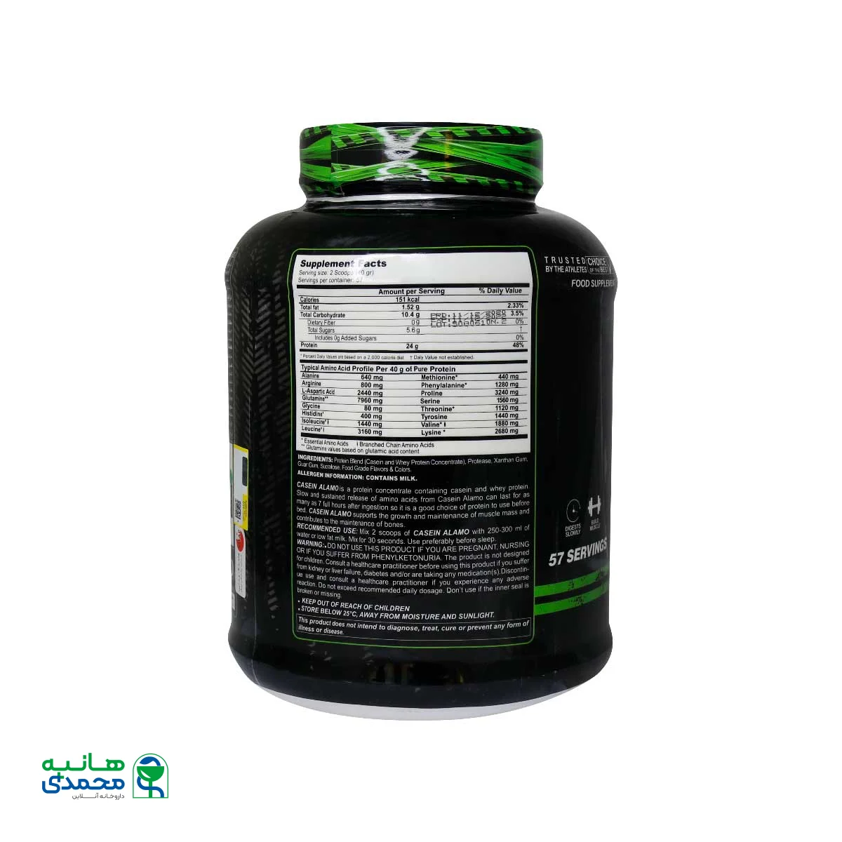 پودر کازئین آلامو یک پروتئین کنسانتره بوده که علاوه بر کازئین حاوی پروتئین وی نیز هست. آزاد شدن اسید آمینه کازئین در این مکمل به صورت آرام و پیوسته صورت میگیرد که میتواند تا بیشتر از 7 ساعت بعد از مصرف تداوم داشته باشد. بنابراین این محصول یک گزینه مناسب پروتئین برای مصرف قبل از خواب به شمار میآید. کمک به رشد توده عضلانی، نگهداری از حجم عضلات و استخوانها از فواید مصرف این مکمل است. به جز اسیدهای آمینه و پروتئین، کربوهیدرات نیز در این محصول وجود دارد. این پودر با طعم شکلات شیری و بیسکوییت وانیلی عرضه میشود و طرفداران زیادی دارد. همراه با آب یا شیر کمچرب میتوانید از این مکمل استفاده نمایید. فراموش نکنید که بهترین زمان مصرف این محصول شب هنگام و پیش از رفتن به رختخواب است.