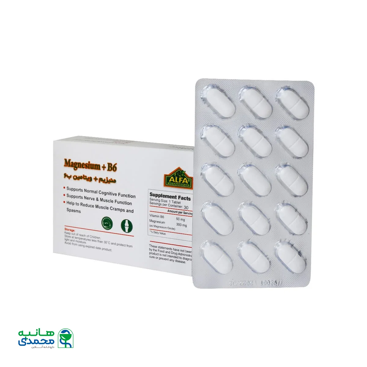 قرص منیزیم و ویتامین B6 آلفا ویتامینز ساخت کشور آمریکا بوده و در بسته‌های 60 عددی عرضه و توزیع می‌شود. ریز مغذی حیاتی منیزیم به افزایش جذب کلسیم در بدن کمک می‌کند و یکی از مهم‌ترین و ضروری‌ترین مواد معدنی مورد نیاز بدن است که باید در برنامه‌های غذایی گنجانده شود. منیزیم به عملکرد سیستم اعصاب کمک می‌کند و همچنین برای سلامت قلب، عضله و کلیه مفید است. منیزیم به بهبود کیفیت خواب کمک می‌کند و درمانی برای بی خوابی افراد است. این ماده معدنی در تنظیم فشار خون نقش مهم و بسزایی دارد. کمبود منیزیم سبب بی اشتهایی، اسپاسم عضلات و گرفتگی آن‌ها، افزایش فشار خون، بروز سندرم پیش از قاعدگی در زنان، میگرن و بی خوابی می‌شود. از این رو برای کمبود آن باید از مکمل‌های حاوی منیزیم استفاده کرد. جهت مشاهده قیمت و خرید منیزیم به دسته بندی مربوطه در سایت دکتر هانیه محمدی مراجعه کنید.