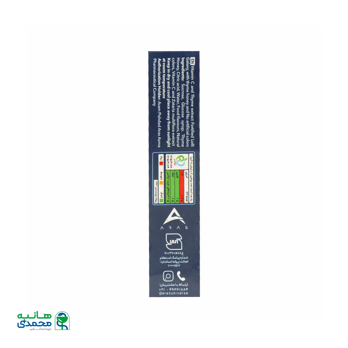 آبنبات لالی گلکسی ارس یونیورس حاوی ترکیبات طبیعی و ایمن مانند ویتامین C و عصاره آویشن است و بر پایه عسل آویشن و با رنگ طبیعی تولید شده است. ترکیبات موجود در این محصول، علاوه بر تسکین سرفه و گلودرد، خاصیت ضد ویروسی، باکتریایی و تقویت کننده سیستم ایمنی را نیز دارا است و آن را به انتخابی سالم و کاربردی برای روزهای سرد یا فصول آلرژیزا تبدیل میکند.