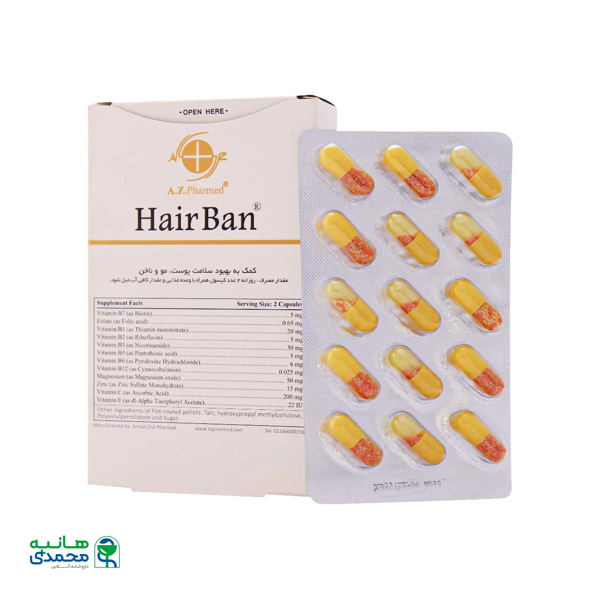 اگر به دنبال قرص تقویتی برای ریزش موی سر خود هستید، کپسول هیربان Hair Ban گزینه مناسبی برای شماست. این قرص در ترکیبات خود بیوتین، زینک، ویتامین سی و ای، ب کمپلکس و منیزیم دارد که در حال حاضر یکی از قرص‌های پرطرفدار برای درمان ریزش مو با اثرگذاری بالا محسوب می‌شود. شما عزیزان می‌توانید برای خرید کپسول هیربان آرمان زیست فارمد از همین صفحه اقدام کنید و در صورت تمایل برای مشاوره حضوری و آنلاین با ما در ارتباط باشید.