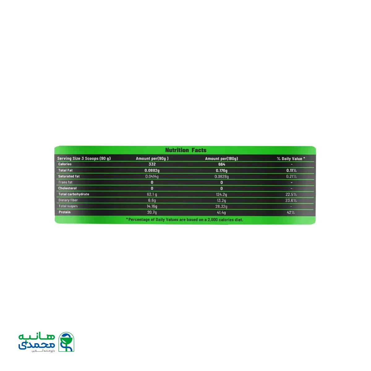 | کربوهیدرات | 62.1g | 22.5% |