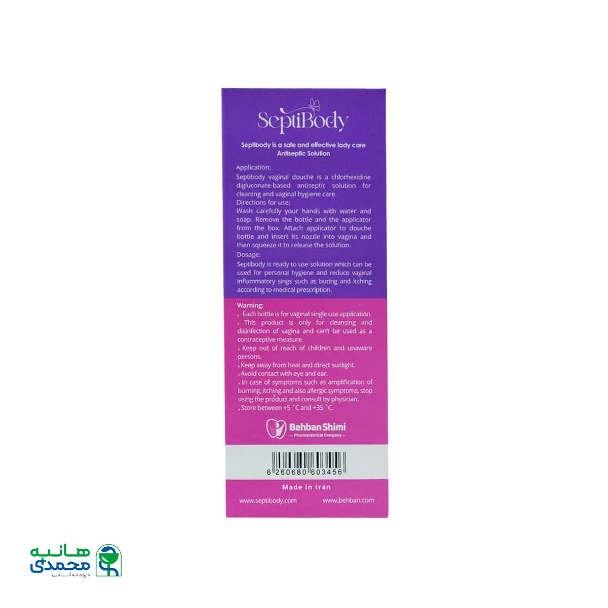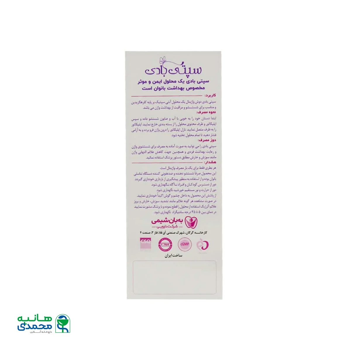 محلول سپتی بادی بر پایه ماده ضد میکروبی کلرهگزیدین دی گلوکونات است که به بهبود و حفظ سلامت ناحیه واژینال کمک میکند. کلرهگزیدین یک ماده ضد میکروبی است که به طور خاص برای شستشو و مراقبت از بهداشت واژن بانوان به کار رفته و بدون ایجاد حساسیت یا آسیب و با حفظ Ph و حمایت از تکثیر لاکتوباسیلها، محیط واژن را از میکروبها پاک میکند. سپتی بادی به دلیل داشتن مواد نرم کننده و مرطوب کننده در ترکیبات آن، از خشکی و تحریک پوست واژن جلوگیری کرده و باعث ایجاد حس راحتی در طول دوره استفاده میشود.