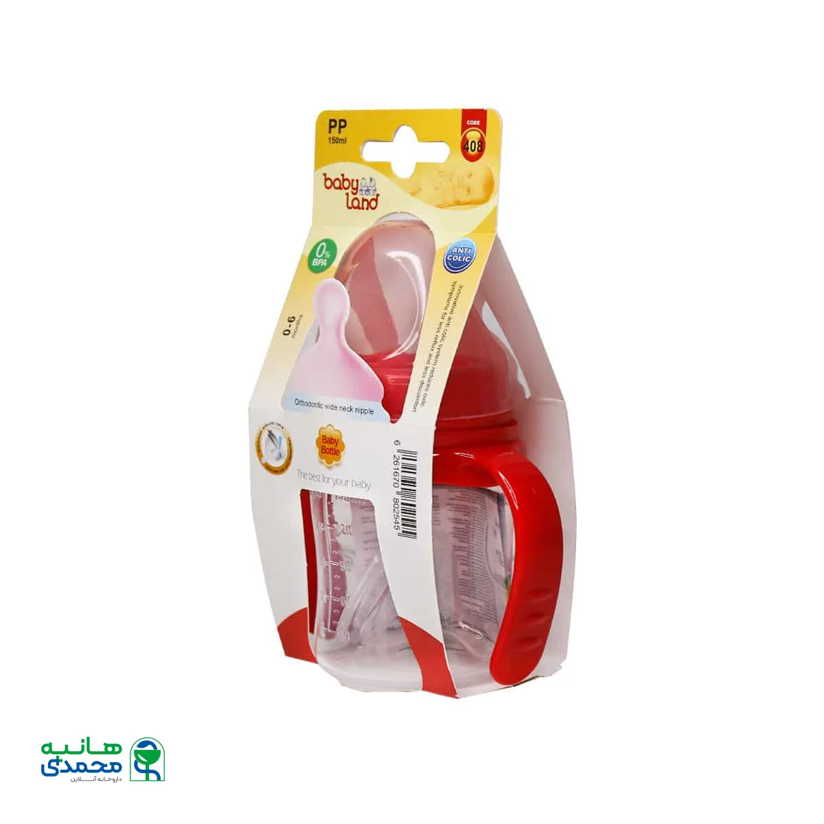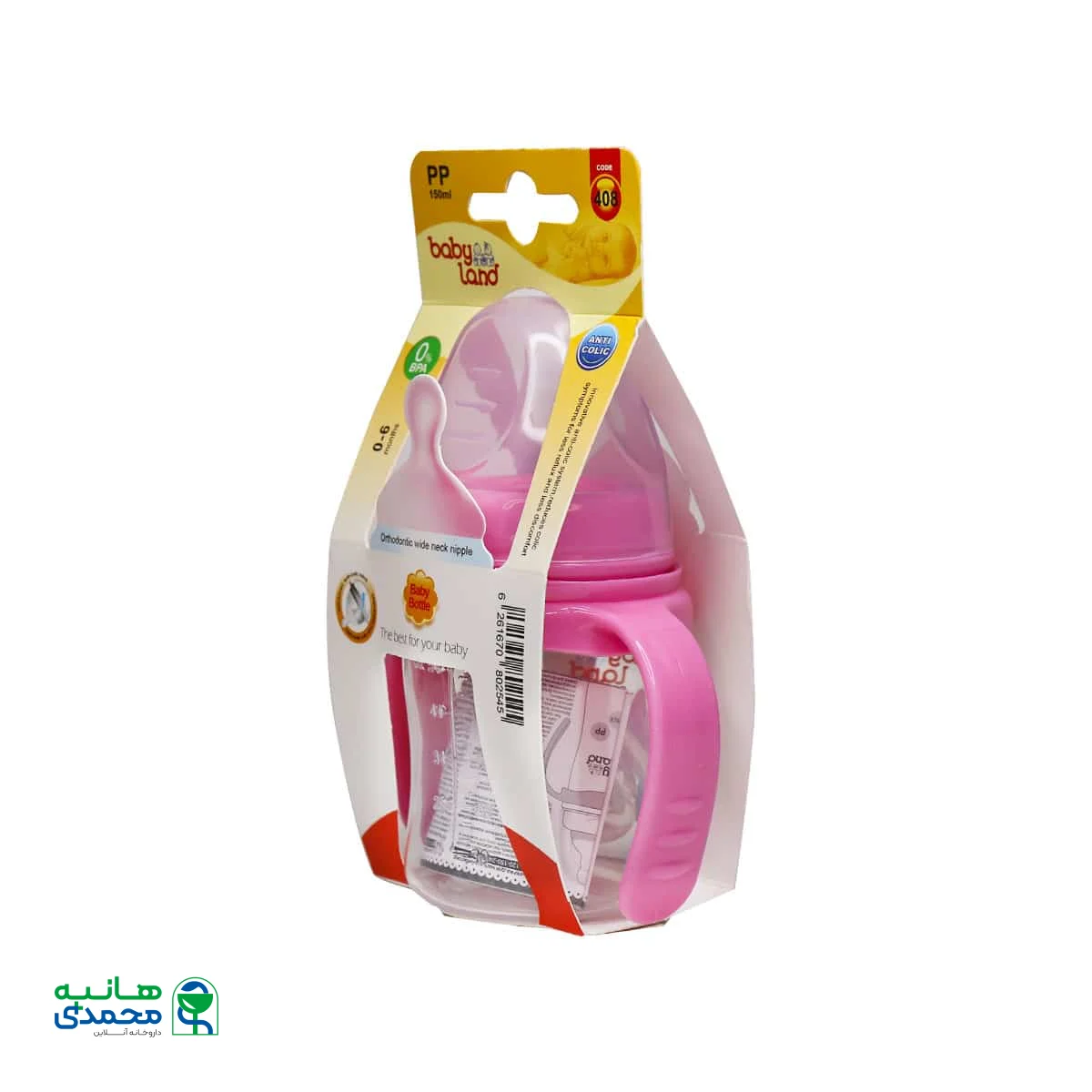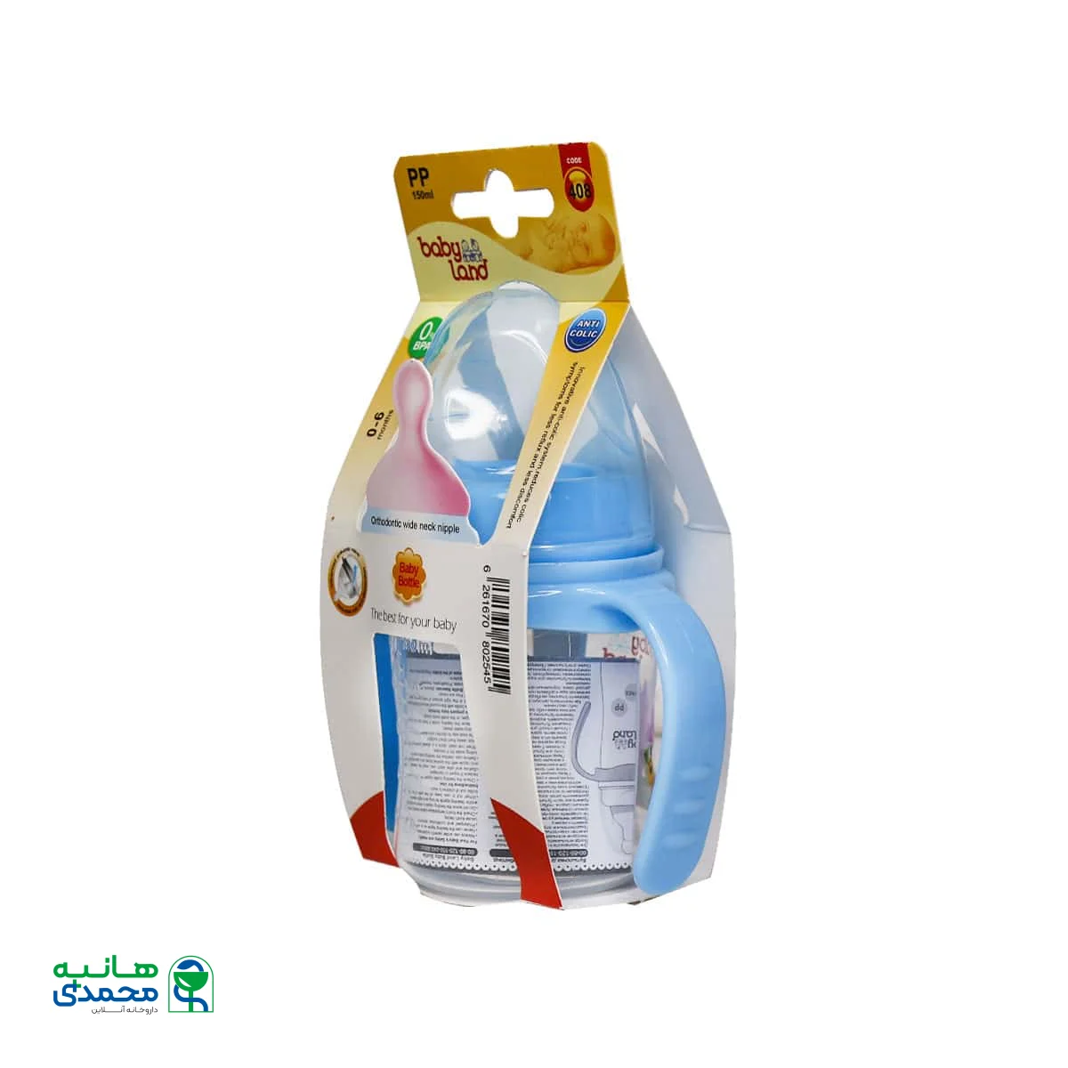 شیشه شیر آنتی کولیک بیبی لند کد 408 با خاصیت ضد نفخ برای نوزادان از بدو تولد تا 6 ماه مناسب است. این محصول دارای سرشیشه ارتودنسی بوده و برای راحتی نوزادان دسته دار است.