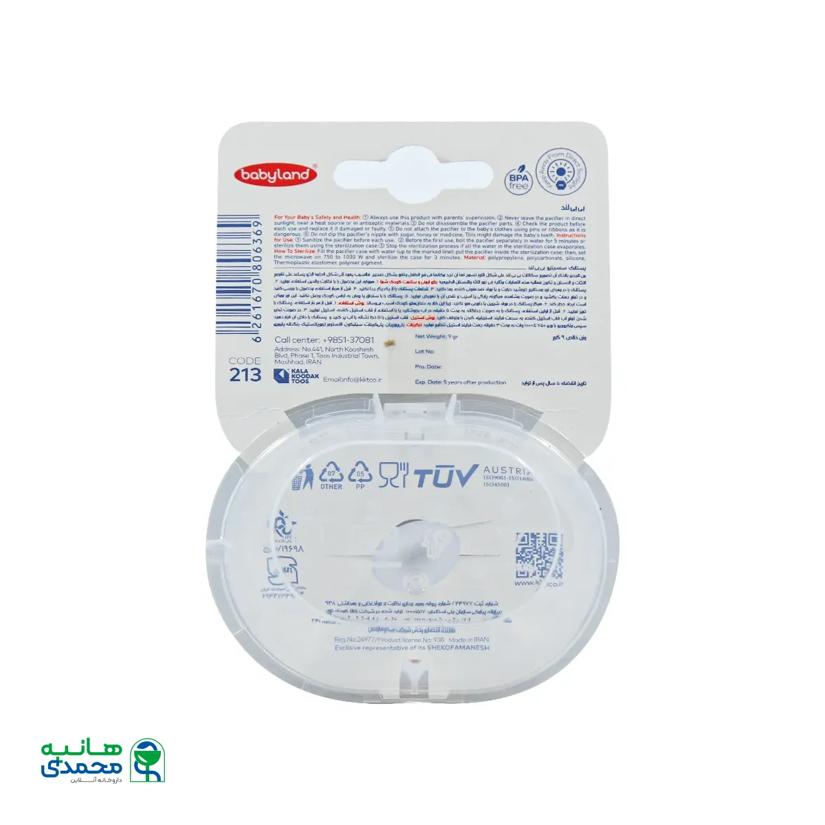 • قبل از اولین استفاده، پستانک کد 213 بی بی لند را به صورت جداگانه به مدت 5 دقیقه در آب بجوشانید یا با استفاده از قاب استریل کننده، استریل نمایید.