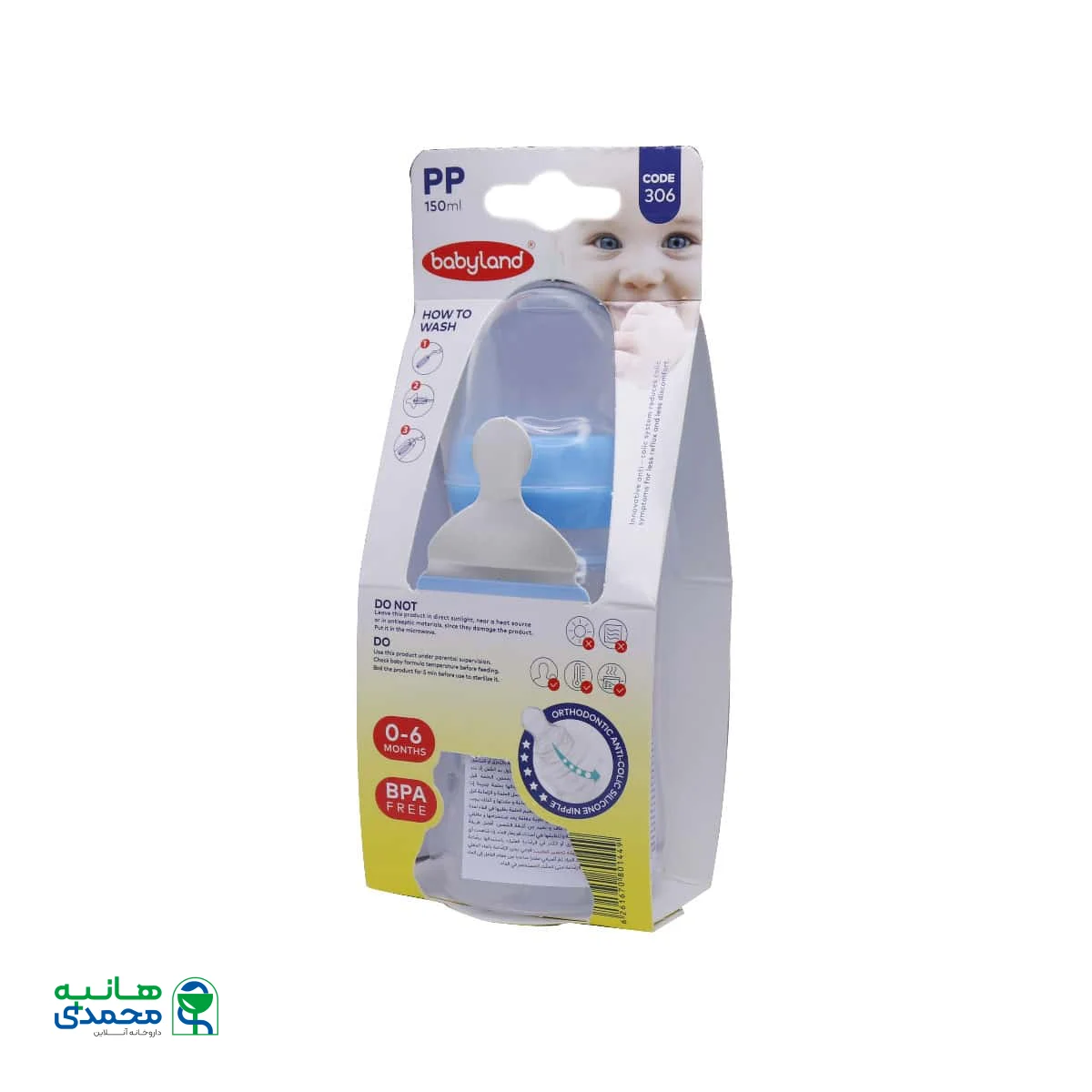 شیشه شیر بیبی لند کد 306 مناسب 0 تا 6 ماه از جنس پلی پروپیلن و مواد مرغوب و با کیفیت ساخته شده است و فاقد مواد مضر PBA است. این شیشه شیر خوب، محصولی از برند معتبر بی بی لند babyland است. وزن بسیار سبک، خاصیت نشکن، سری ارتودنسی ارگونومیک از جمله ویژگیهای این شیشه است که آن را از سایر شیشه شیرها متمایز کرده است. این شیشهشیر با بدنهای از جنس پلیپروپیلن، ظرفیتی برابر ۱۵۰ میلیلیتر را به خود اختصاص داده است. سرشیشه این مدل از جنس سیلیکون بوده و انعطافپذیر است. این سری به وسیله درپوش پلاستیکی شفافی پوشانده میشود. درپوش شیشه شیر نوزاد بیبی لند به راحتی باز و بسته شده و از نشت شیر به بیرون از بطری جلوگیری میکند. درجه بندی واضح روی شیشه هم دیگر ویژگی خاص این محصول است که آن را تبدیل به بهترین شیشه شیر کرده است.