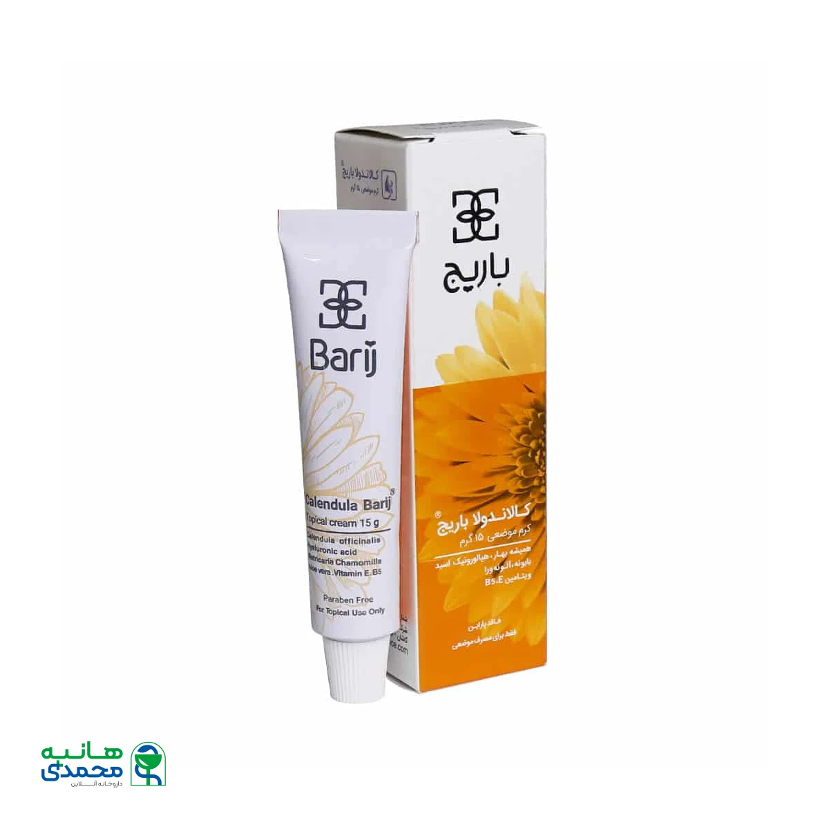 کرم موضعی کالاندولا باریج اسانس جهت درمان ادرار سوختگی، رفع التهاب پوست، رفع خارش و قرمزی پوست آسیب دیده مناسب است. این محصول دارای مواد موثر گیاهی آلوئه ورا و گل همیشه بهار است.