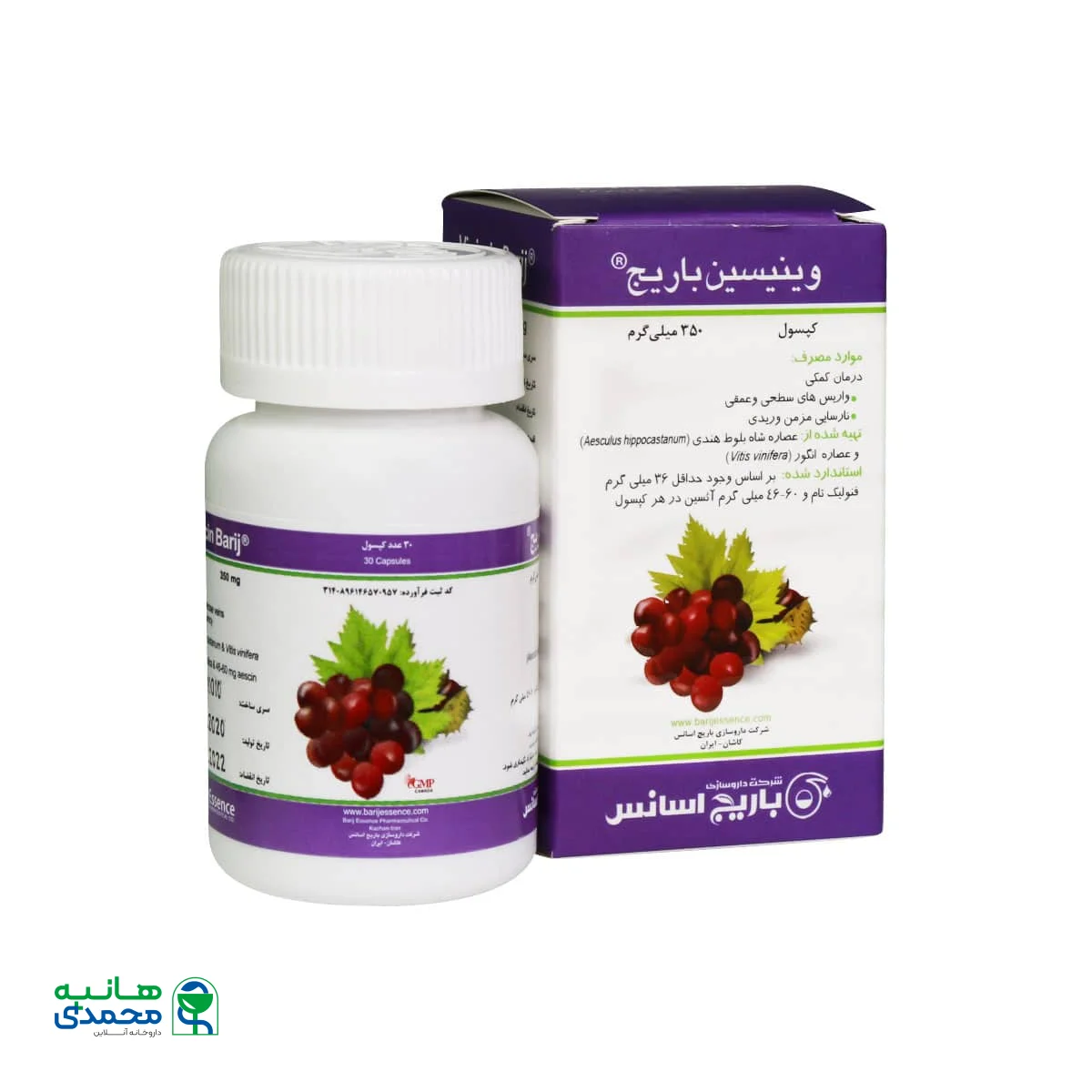 کپسول 350 میلی گرم وینیسین باریج اسانس حاوی عصاره دو گیاه ارزشمند بلوط هندی و انگور بوده و به حفظ سلامت عروق و سیستم گردش خون کمک می کند. این کپسول در بهبود واریس های سطحی و عمقی و نارسایی مزمن وریدی موثر است.