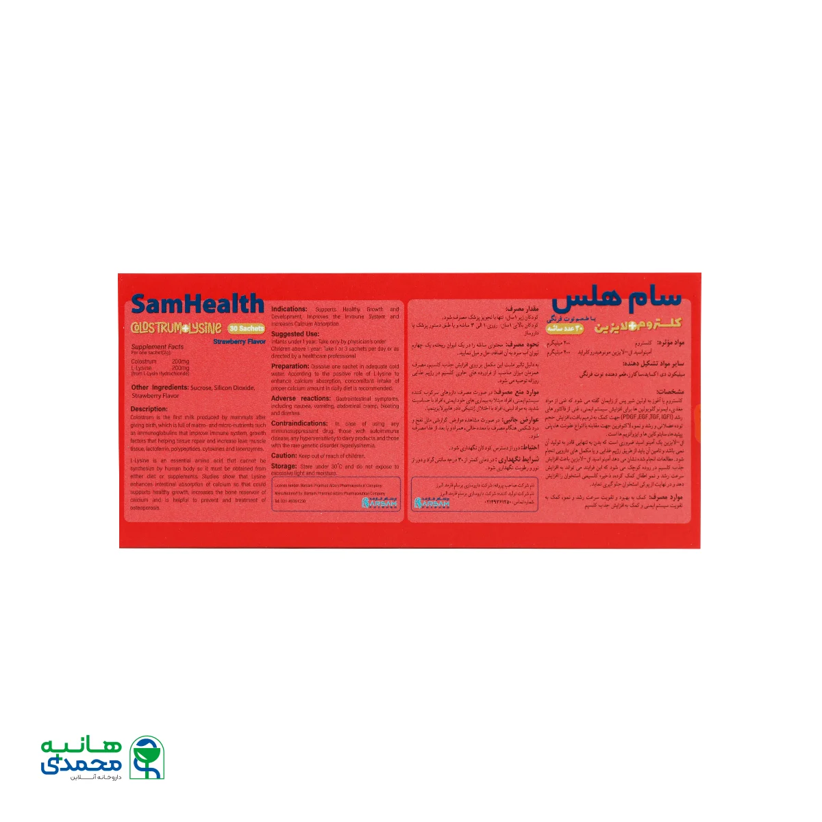 پودر سام هلس برسام فارمد یک مکمل غذایی برای کودکان بوده که از کلستروم یا آغوز و اسید آمینه ال لیزین جهت تقویت رشد و سیستم ایمنی کودکان تولید و روانه بازار شده است. در هر ساشه سام هلث برسام فارمد حاوی 200 میلی گرم کلستروم و 200 میلی گرم ال لیزین است که به بهبود و تقویت سرعت رشد و نمو و افزایش جذب کلسیم کمک میکند.