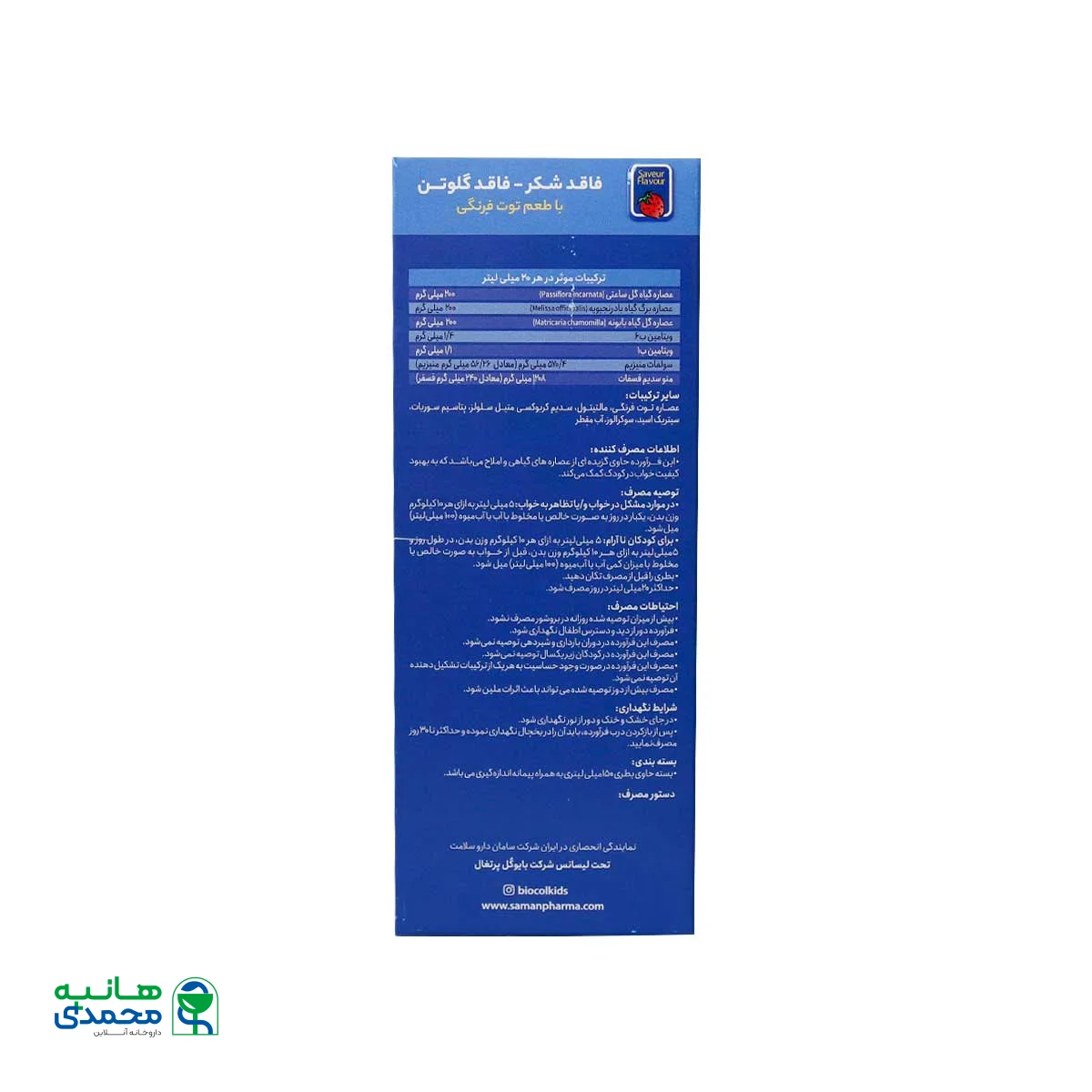 تثبیت کننده، مالتیتول، آب معدنی، مونوسدیم فسفات 1208 میلی گرم یعنی 240 میلی گرم از فسفر یعنی 34.3% منبع ارزش غذایی، منیزیم سولفات 570.4 میلی گرم (54.26 میلی گرم از منیزیم – 15% منبع ارزش غذایی، عصاره گل عشق 200 میلی گرم، عصاره بالم لیمو 200 میلی گرم، عصاره بابونه 200 میلی گرم، سیتریک اسید، سدیم کربوکسی متیل سلولز، اسانس توت فرنگی، پتاسیم سوربات، ساکاروز، ویتامین B6 1.4 میلی گرم، ویتامین B1 1.1 میلی گرم