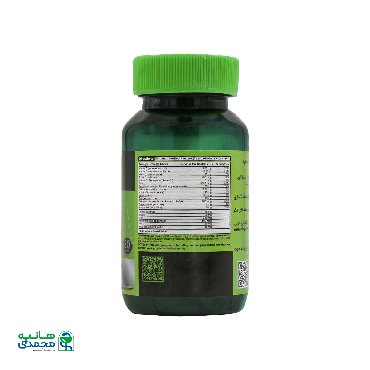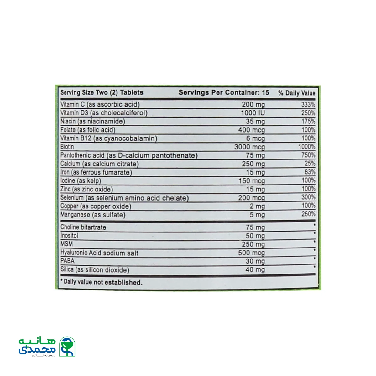 این قرص با دارا بودن 20 ویتامین و مواد معدنی در حجم قابل توجه از ترکیباتی همچون بیوتین علاوه بر تاثیرات شگفت انگیزی که در جلوگیری از ریزش مو دارد جهت رفع کمبودهای ناشی از سایر عناصر لازم در بدن که برای حفظ سلامت عمومی ضروری است مورد استفاده قرار می‌گیرد. آنتی اکسیدان‌های پیشرفته مانند ویتامین A ،C و E به محافظت در برابر آلودگی رادیکال‌های آزاد کمک می‌کند که می‌تواند فرایند پیری سلولی را ارتقاء دهد.