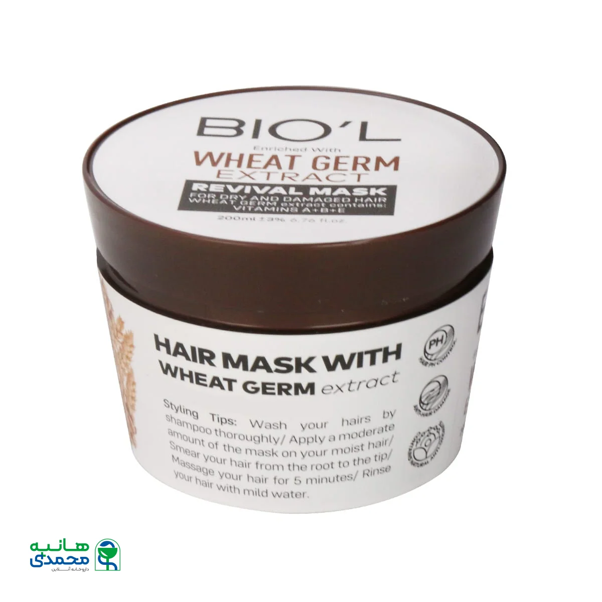 ماسک موهای خشک و آسیب دیده بیول با آبکشی حاوی عصاره جوانه گندم بوده که ویتامین‌های A، B و E و املاح معدنی منیزیم و سلنیوم را در بر دارد. ویتامین A تقویت رشد مو و ترمیم سلولی تارهای مو را به دنبال دارد. گروه B حجم دهنده موها و ترمیم کننده غشای سلولی تارهای موی خشک و آسیب دیده است. ویتامین E نیز افزایش دهنده عمر سلولی موها است. ماسک مو بیول با آبکشی باعث احیای مجدد موها و خنثی شدن آثار سو آلودگی‌های محیط است. بدین صورت استفاده از این ماسک مو می‌تواند موها را در برابر اثر هرگونه مواد شیمیایی و تغییرات محیطی Ph محافظت می‌کند.
