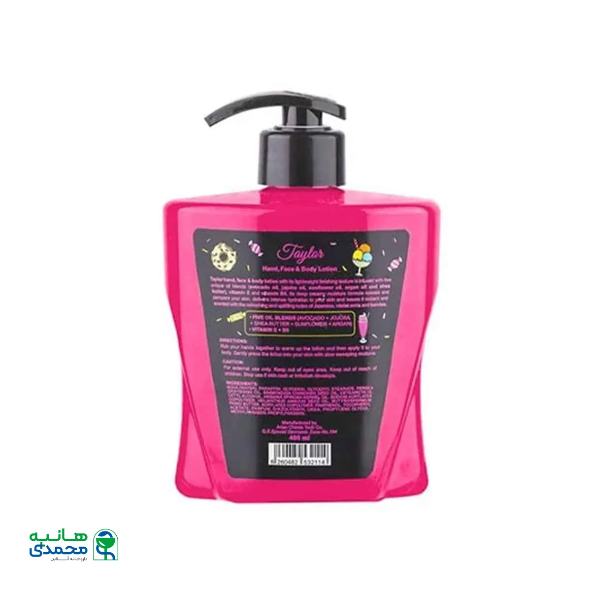 اگر به دنبال یک مرطوب کننده بدن خوب و با کیفیت هستید که بتوانید آن را بر روی دست، صورت و بدن همزمان استفاده نمایید پیشنهاد ما به شما استفاده از لوسیون دست صورت و بدن تیلور کالیستا صورتی است. این محصول حاوی ترکیبات موثری همچون روغن آووکادو، روغن جوجوبا، شی باتر، روغن آفتابگردان و روغن آرگان در کنار ویتامین E و B5 بوده و به خوبی پوستتان را تغذیه رسانی می‌کند. این مرطوب کننده قادر است تا به خوبی پوست شما را آبرسانی و آن را تغذیه کند.