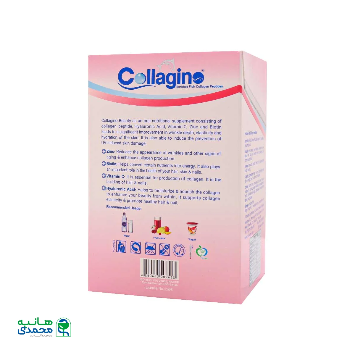 ساشه کلاژن بیوتی کلاژینو صورتی یک محصول منحصر به فرد از شرکت کلاژینو ساخت فرانسه است. کلاژینو بیوتی یک محصول کامل جهت تقویت پوست، مو و ناخن است. این محصول یک مکمل 5 در 1 است که تمام ترکیبات مورد نیاز برای تقویت مو، پوست و ناخن در این محصول به شکل کامل وجود دارد. در ترکیبات این محصول کلاژن، ویتامین سی، زینک، بیوتین و هیالورونیک اسید وجود دارد و به همین دلیل است که آن را به عنوان یک مکمل عالی برای پوست، مو و ناخن تبدیل کرده است. کلاژن استفاده شده در این ساشه از ماهی گرفته شده است.