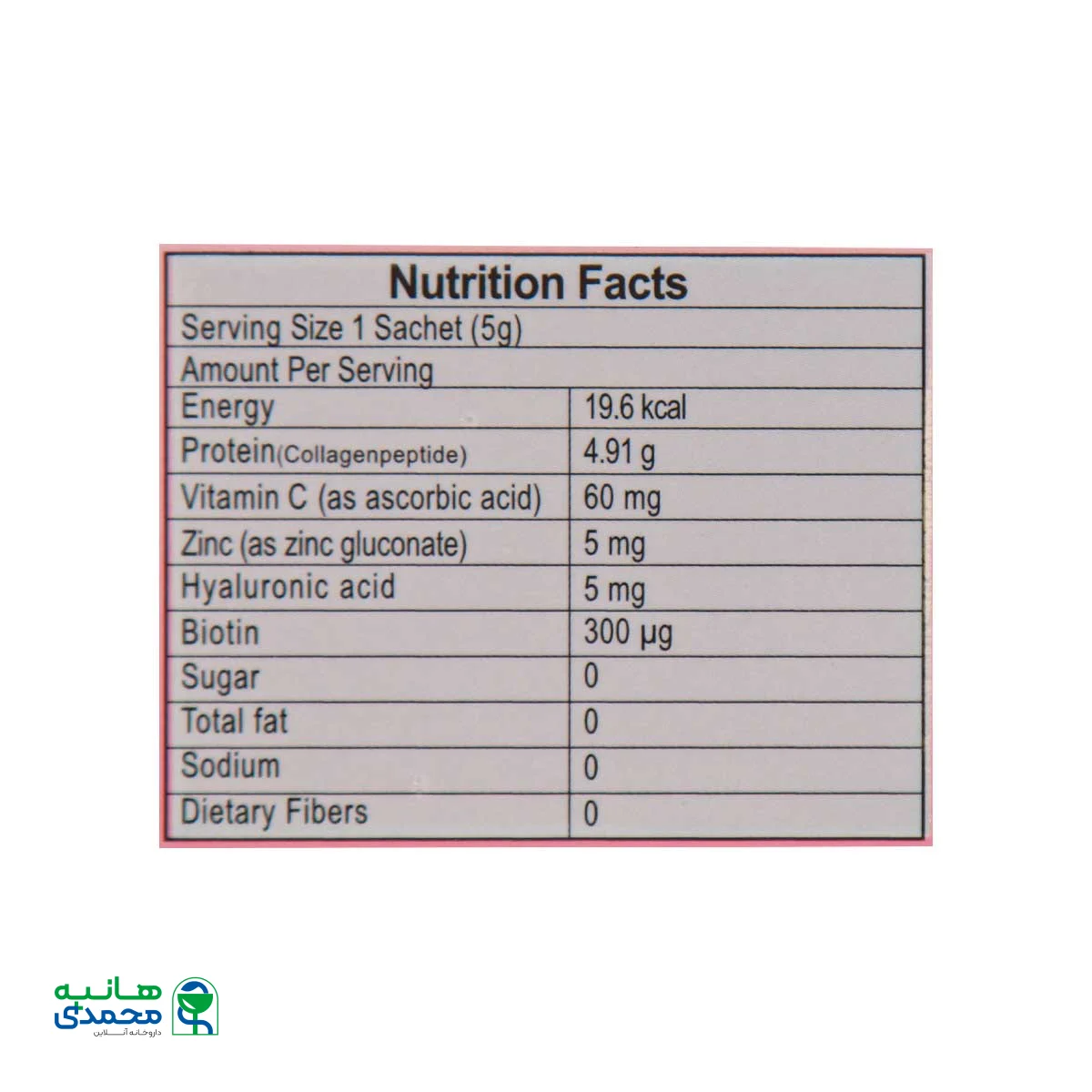 جدول ترکیبات کلاژن به ازای هر ساشه