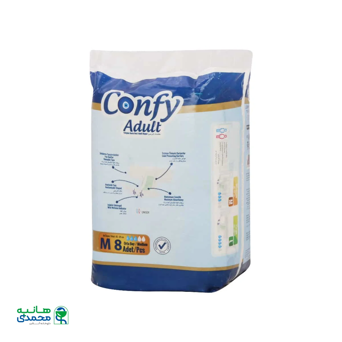 کهولت سن یا برخی از بیماریها در افراد ممکن است باعث ایجاد بیاختیاری در ادرار و مدفوع شود که سادهترین روش برای برطرف کردن این مشکل خرید پوشک بزرگسال است. پوشک بزرگسال کانفی سایز متوسط محصول کشور ترکیه با قیمت مناسب و کیفیت عالی در دسترس مصرف کنندگان قرار گرفته است تا نیاز مصرفی آنها را به نحو احسنت برطرف نماید. سایز متوسط پوشینه کانفی برای دور کمر 80 تا 110 سانتی متر است. پودر جاذب موجود در این پوشک به کمک لایههای جاذب، قدرت جذب این پوشک را تا دو برابر حد معمول افزایش داده است.