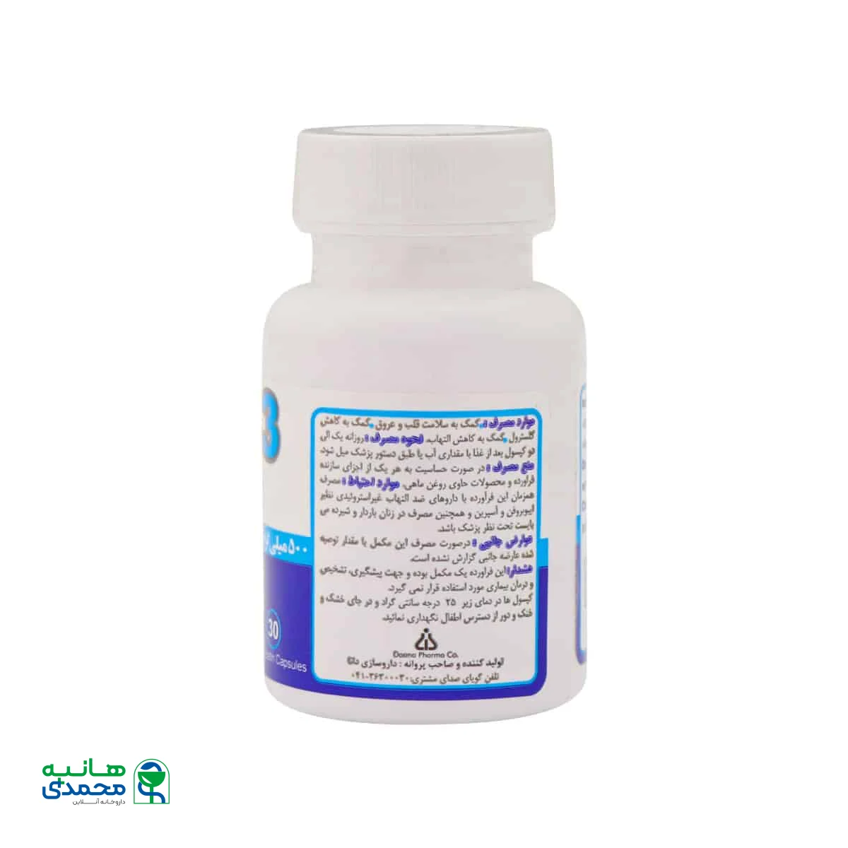 سافت ژل امگا 3 500 میلی گرم دانا ساخت کشور ایران به حفظ سلامت قلب و عروق، کاهش کلسترول، پیشگیری از زوال عقل و کاهش التهاب کمک موثری میکند. این کپسول حاوی اسیدهای چرب امگا3 و EPA و DHA است و به بهبود عملکرد مغز و بینایی میپردازد. از طرفی مصرف مکمل امگا تری در روزهایی که هوا آلوده است، توصیه میشود زیرا به دفع مواد سمی همچون مس و جیوه کمک میکند.