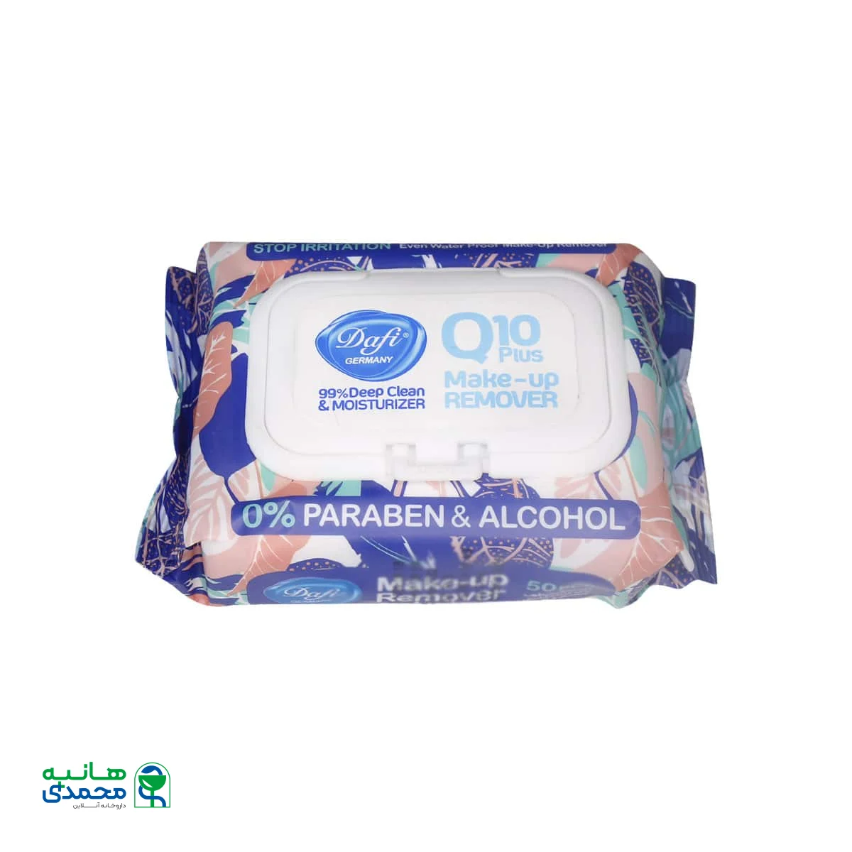 دستمال مرطوب پاک کننده آرایش چشم و صورت دافی ۵۰ عددی مدل Q10 plus حاوی عصاره گل گیلاس ژاپنی، پاک کننده آرایش ضد آب و حاوی کوآنزیم کیوتن جهت متعادل کردن pH پوست است.