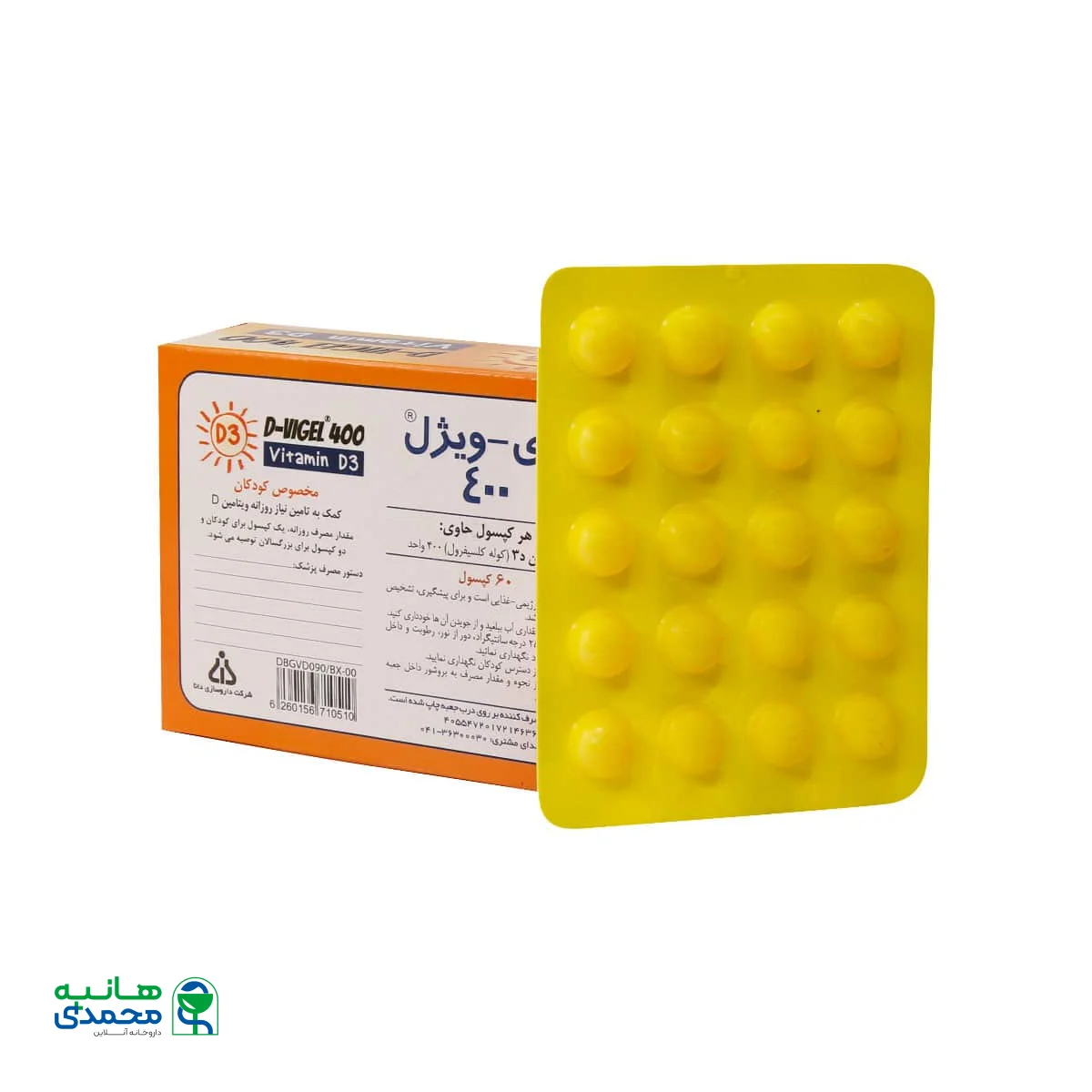 کپسول دی ویژل 400 دانا به عنوان مکمل رژیمی غذایی جهت تامین نیاز روزانه و رفع کمبود ویتامین D مصرف می‌شود. گفتنی است ویتامین د از دسته ویتامین‌های محلول در چربی است که برای افزایش جذب کلسیم و فسفر از روده کوچک و تشکیل بافت استخوان ضروری است. کوله کلسیفرول (ویتامین D3) همراه با دو هورمون پاراتورمون و کلسی تونین غلظت سمی کلسیم را تنظیم می‌کند. به همین علت مصرف این قرص ویتامین D موجب تقویت و رشد استخوان و دندان کودکان می‌شود.