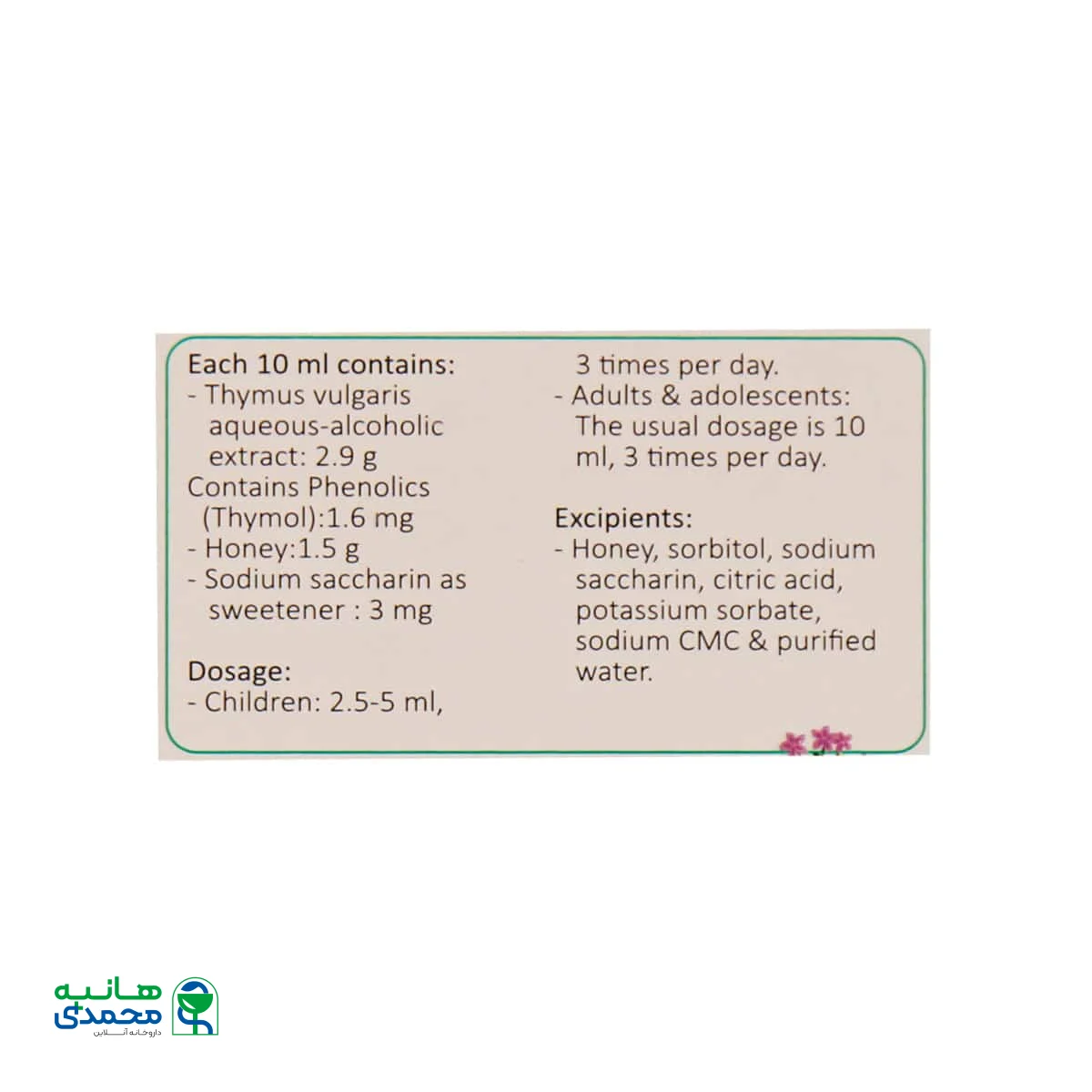 این شربت خلط آور گیاهی از عصاره آویشن و عسل در ترکیبات خود استفاده کرده است که در آرام کردن گلو و تسکین سرفه موثر است. در ادامه به بررسی ترکیبات موجود در این محصول می‌پردازیم: