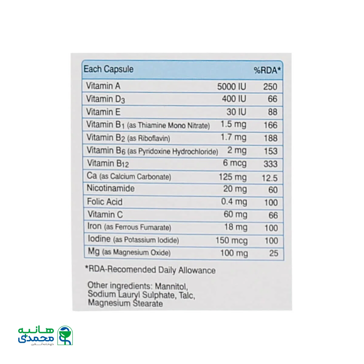 | فولیک اسید | 0/4mg | 100% |