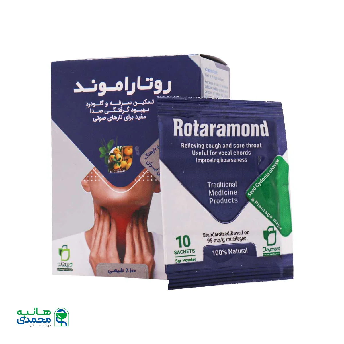 ساشه روتاراموند دیموند از ترکیباتی مانند دانه به و بارهنگ تشکیل شده است که به عنوان تسکین دهنده طبیعی جهت تسکین سرفه و گلو درد شناخته شده‌اند. سرفه و گلو درد اغلب ناشی از التهاب و عفونت در حلق و دستگاه تنفسی است که می‌توان با خرید دارو برای سرفه و استفاده از آن در کمترین زمان ممکن چنین عارضه‌هایی را برطرف نمود. علاوه بر آن با توجه به ترکیبات طبیعی این فراورده، ساشه rotaramond دیموند به عنوان یک ضد التهاب موثر عمل نموده و باعث تسکین علائم گرفتگی صدا می‌شود. البته ناگفته نماند این محصول به صورت موثری بر تقویت سیستم ایمنی نیز تاثیر می‌گذارد.