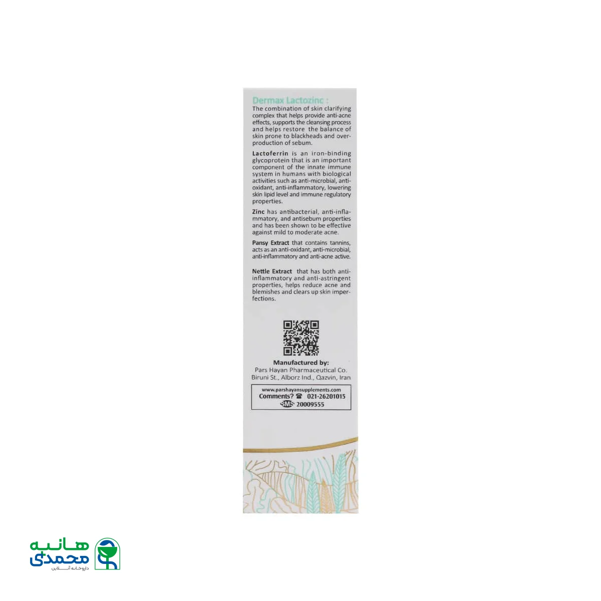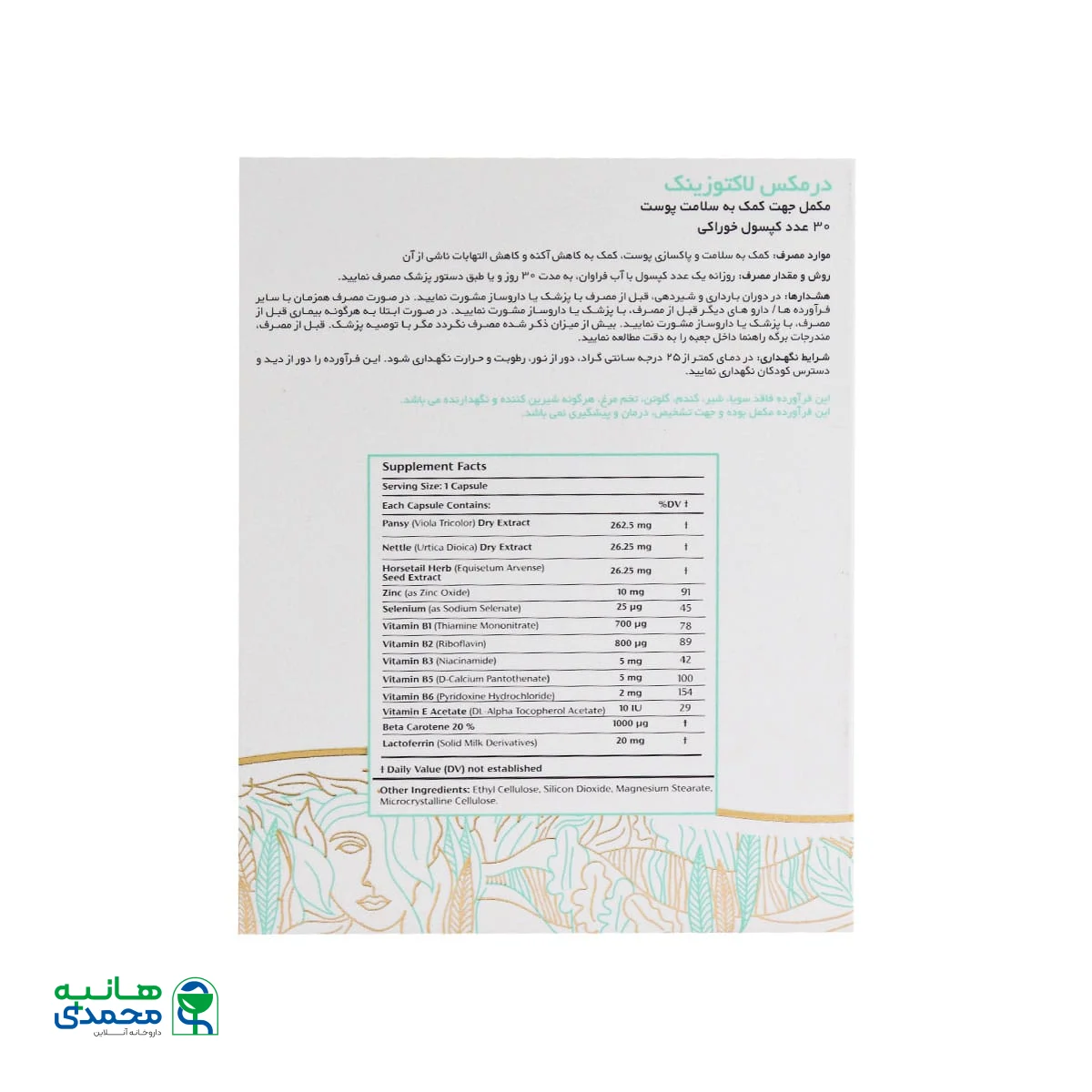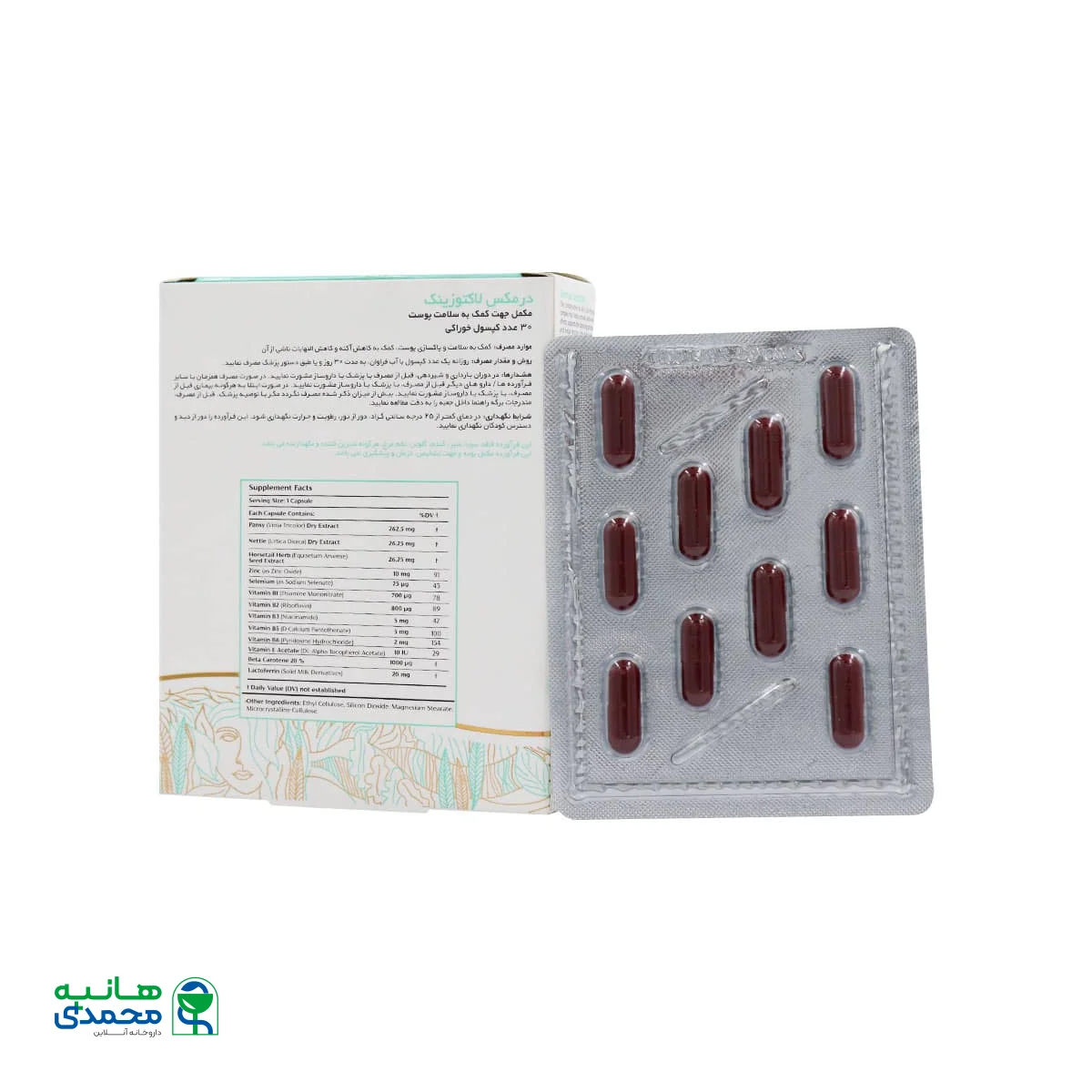کپسول لاکتوزینک درمکس با داشتن ترکیبات گیاهی و ویتامینهای مورد نیاز بدن به سلامت و پاکسازی پوست کمک میکند. همچنین لاکتوزینک در بهبود التهابات ناشی از آکنه، تاثیر بسزایی دارد. لاکتو زینک را میتوان بهترین مولتی ویتامین برای پوست دانست، چرا که دارای ریزمغذیهایی بوده که باعث ساخت کلاژن و افزایش استحکام پوست و حفاظت از سلولهای پوست، مو و ناخن میشوند. مزیت اصلی لاکتوزینک درمکس به عنوان قرص برای تقویت پوست و مو این است که این قرص توسط جریان خون، مواد مغذی را به عمیق ترین قسمتهای پوست هدایت میکند.