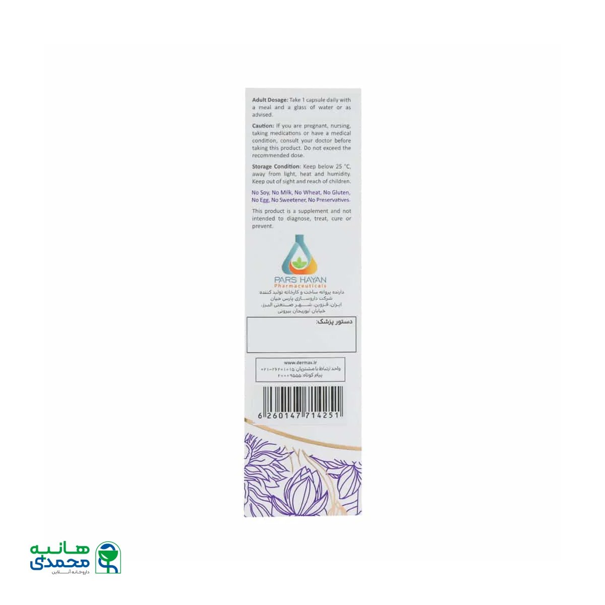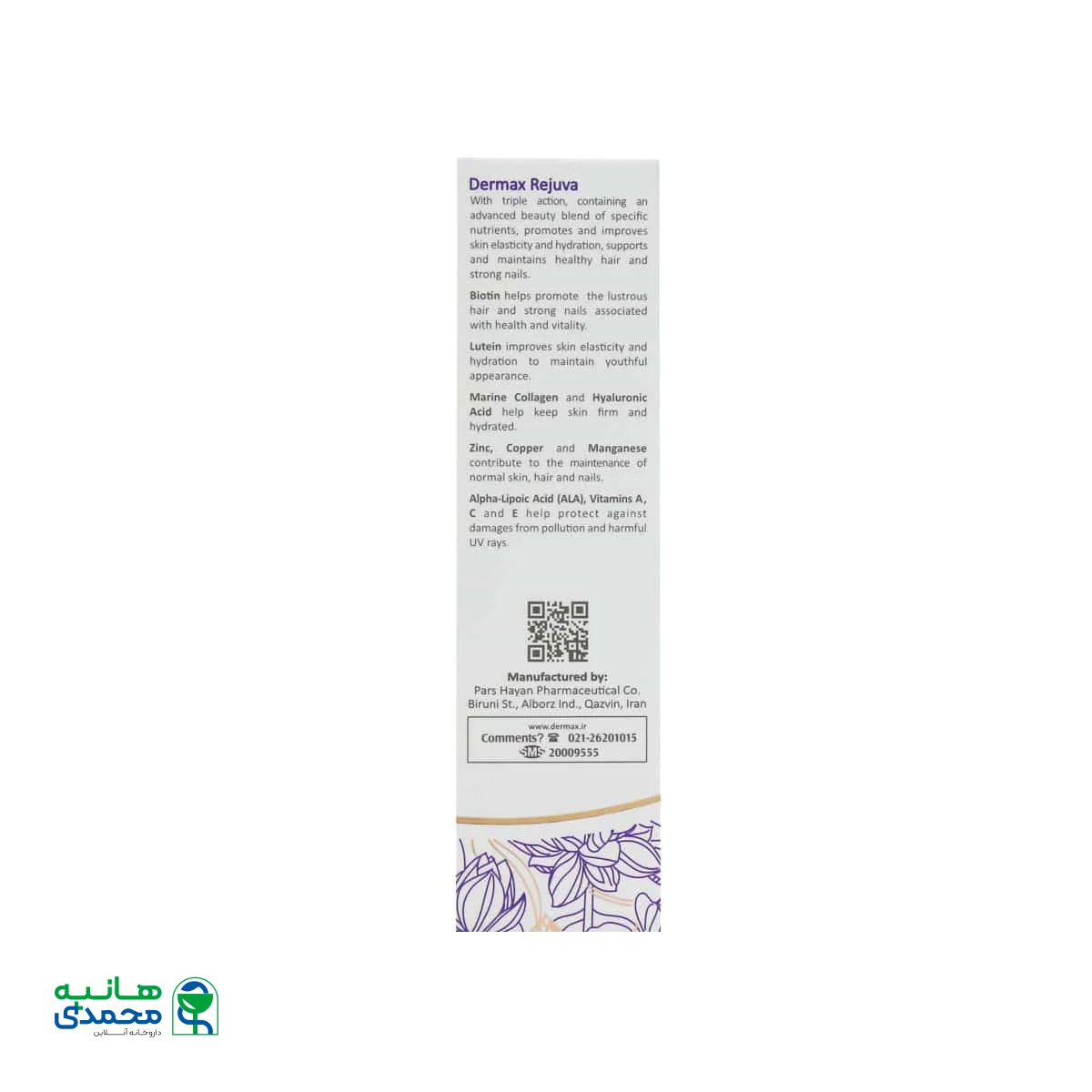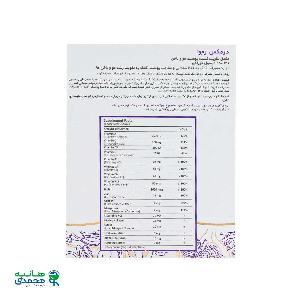 کپسول رجوا درمکس ترکیبی از مواد طبیعی است که در حفظ سلامت و افزایش شادابی، طراوت و زیبایی پوست، مو و ناخن نقش بسزایی ایفا میکند. این کپسول فاقد سویا، شیر، گندم، گلوتن، تخم مرغ و هر گونه شیرین کننده و نگهدارنده بوده که به سلامت عمومی بدن کمک میکند.