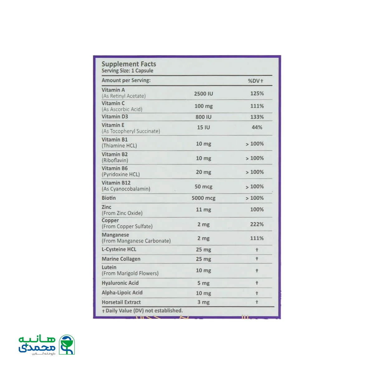 هر کپسول آن حاوی کلاژن دریایی، بیوتین، سیستین، ویتامینهای A، E و C، مس، منگنز و … است که در ادامه به توضیح آن میپردازیم: