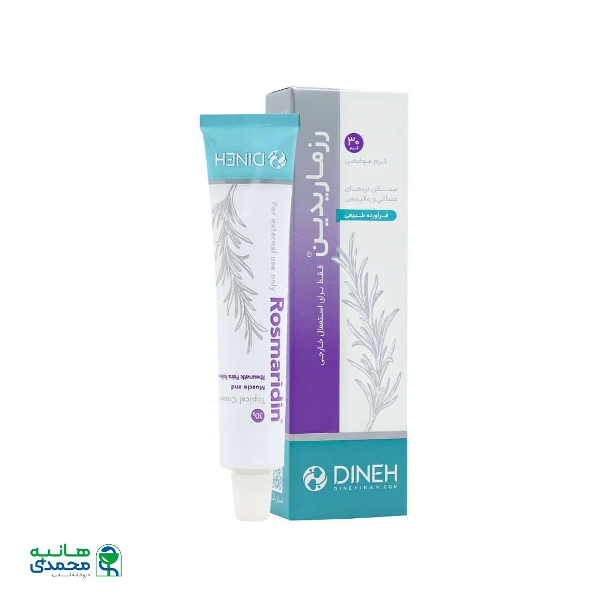 کرم رزماریدین دینه یک ضد درد موضعی گیاهی است که به عنوان کمک درمان مناسبی جهت دردهای روماتیسمی و همچنین دردهای عضلانی و مفاصل، کشیدگی تاندونها و در رفتگی (بخصوص در ورزشکاران) کاربرد دارد. خواص گیاه رزماری بر کسی پوشیده نیست و این فراورده با دارا بودن مقادیر قابل توجهی از این اسانس، میتواند مرهمی بر دردهای عضلانی، کوفتگی و کشیدگی باشد.