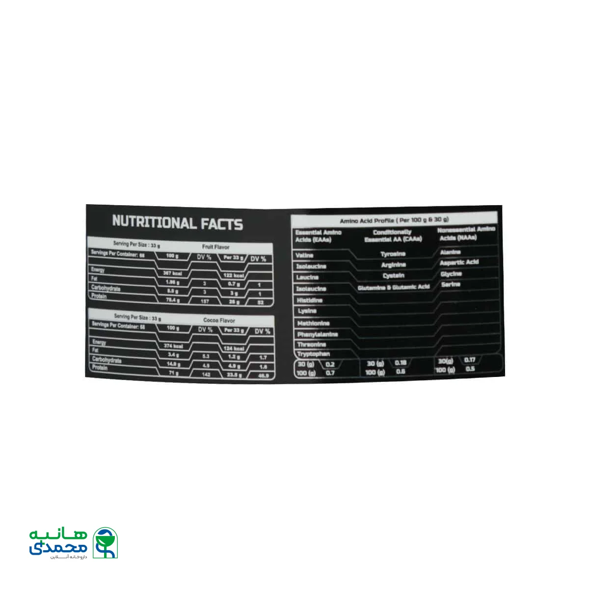 جدول ترکیبات در هر 33 گرم پودر پروتئین کازئین نایت پرو دکتر سان
