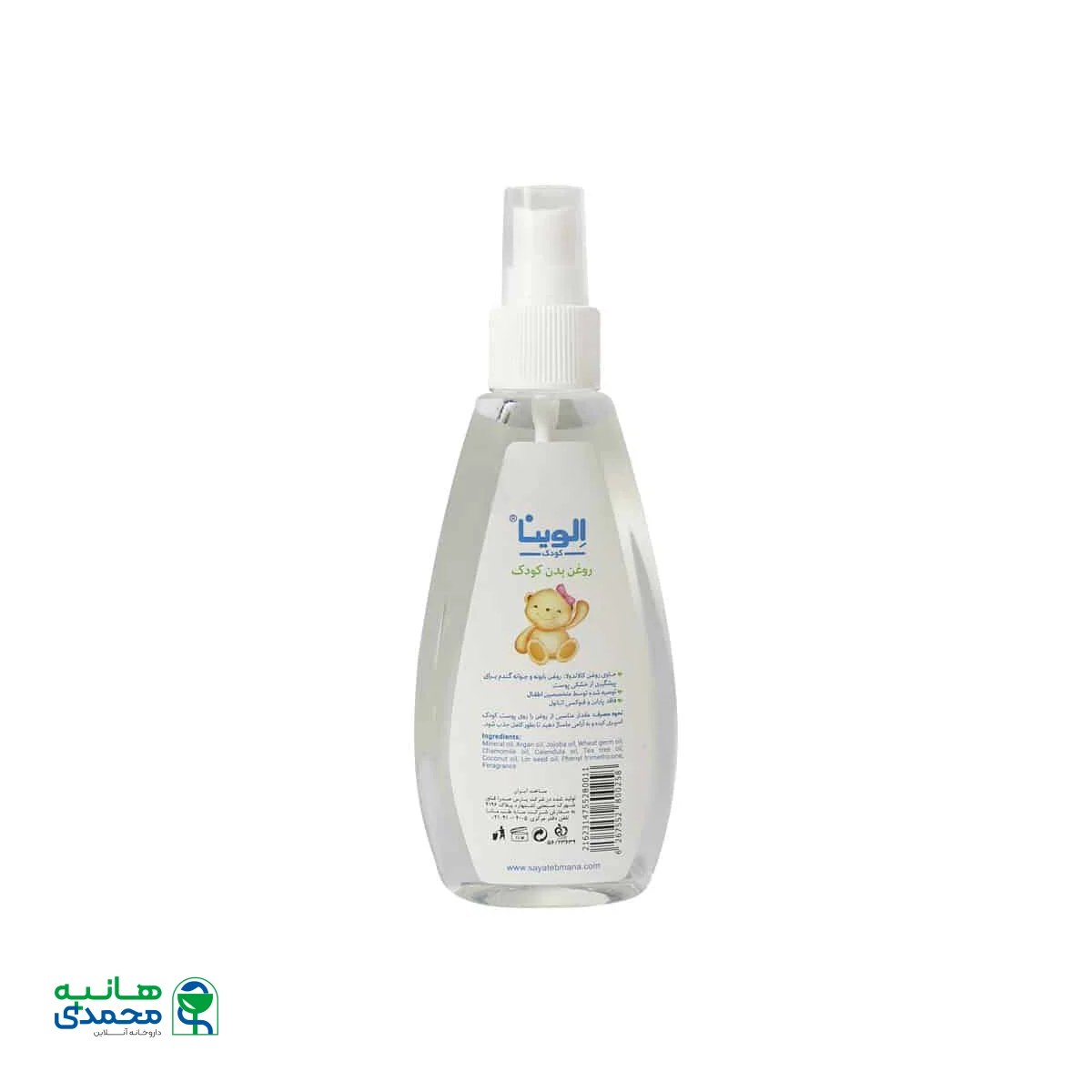 روغن بدن کودک الوینا یکی از محصولات تخصصی و بهداشتی کودک است که با پوست نازک کودکان بسیار سازگاری دارد. از این روغن میتوان برای ماساژ بدن کودک و بزرگسالان استفاده نمود تا رطوبت پوست حفظ شود. ساختار اسپری بودن روغن الوینا استفاده از آن را آسانتر نموده و جذب نیز سریعتر رخ میدهد. این روغن به صورت یک لایه بر روی پوست قرار گرفته و از هرگونه آسیب یا خشکی بر روی پوست ممانعت مینماید. محصول تولید شده توسط برند الوینا مورد تایید متخصصین اطفال بوده و در عین اثر بخش بودن، حس خوب و خوشایندی را در زمان استفاده برای کوک فراهم میکند.
