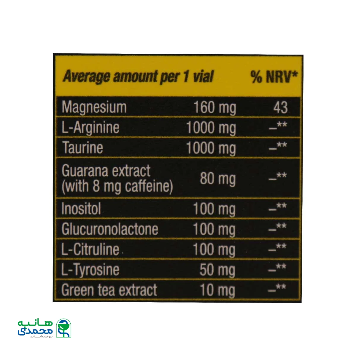 • منیزیم: در هر ویال انرژی شات به میزان 160 میلی گرم از مینرال منیزیم جهت افزایش سطح انرژی، رفع گرفتگی عضلانی در ورزشکاران و کاهش خستگی وجود دارد.
