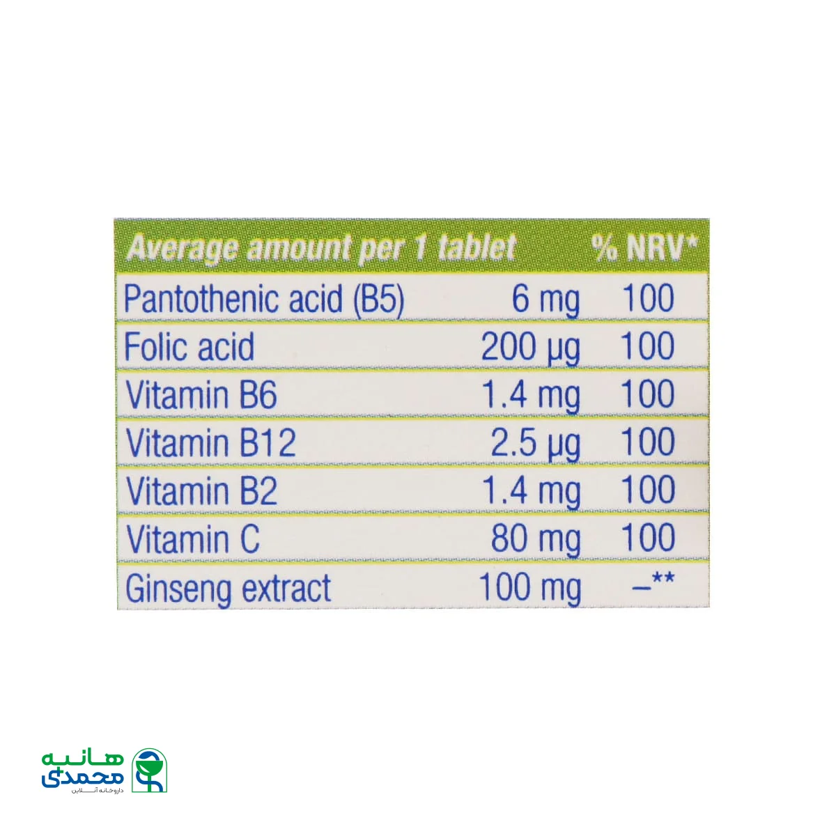• حاوی عصاره جینسینگ به همراه ویتامین‌های B2، B6، B12، C و فولیک اسید