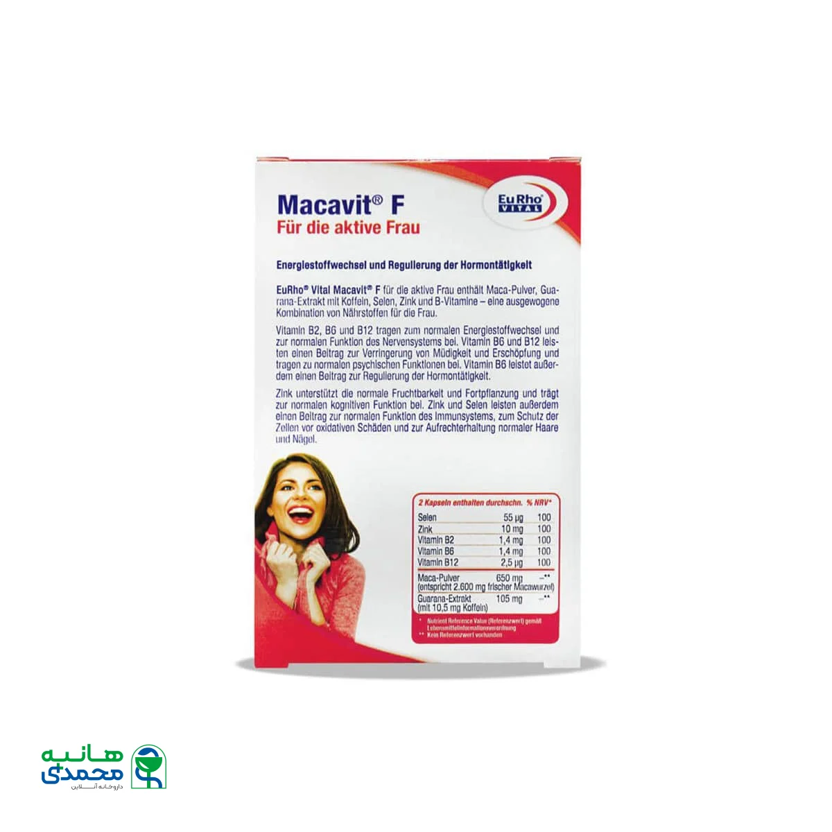 قرص Macavit F یوروویتال، مکملی تخصصی برای بانوان است که با بهره‌گیری از ویتامین‌ها، مواد معدنی و عصاره‌های گیاهی به افزایش انرژی، کاهش خستگی، بهبود خلق و خو و تنظیم فعالیت‌های هورمونی در بدن بانوان کمک می‌کند. از طرفی این مکمل، نقش مثبتی در تقویت میل و عملکرد جنسی دارد. ماکاویت اف بانوان یوروویتال گزینه‌ای مناسب برای خانم‌هایی است که در دوره‌های پرتنش پس از زایمان یا در آستانه یائسگی قرار دارند و به دنبال راهی طبیعی برای بازگرداندن تعادل جسمی و روحی خود هستند. مصرف منطم این مکمل، نقش موثری در ارتقاء حس شادابی و رضایت‌مندی بانوان دارد.