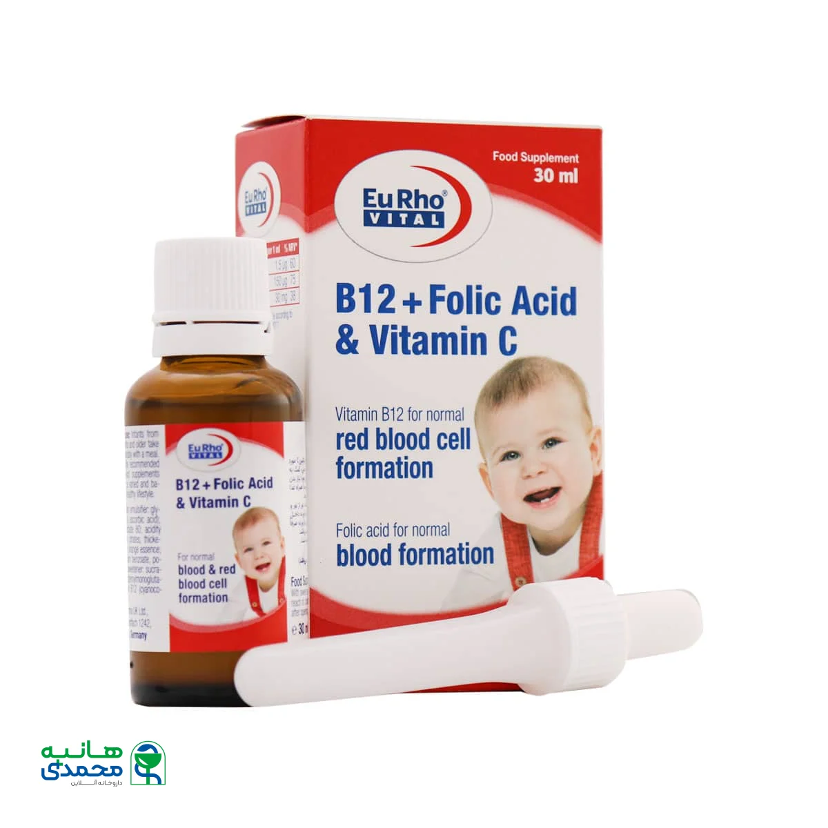 قطره B12 فولیک اسید و ویتامین C یوروویتال محصولی مناسب جهت کمک به ساخت گلبول‌های قرمز و رفع کم خونی است. این محصول قادر است به بهبود رشد جسمی و ذهنی کودکان کمک نموده و برای تامین انرژی مورد نیاز بدن نیز کاربرد داشته باشد. فولیک اسید یکی از مهم‌ترین ویتامین‌ها برای کودک به ویژه در ماه‌های اولیه زندگی است. فولیک اسید تاثیرات بسیاری از جمله بهبود رشد ذهنی و جسمی و همچنین کمک به سلامت سیستم عصبی مرکزی کودک دارد.