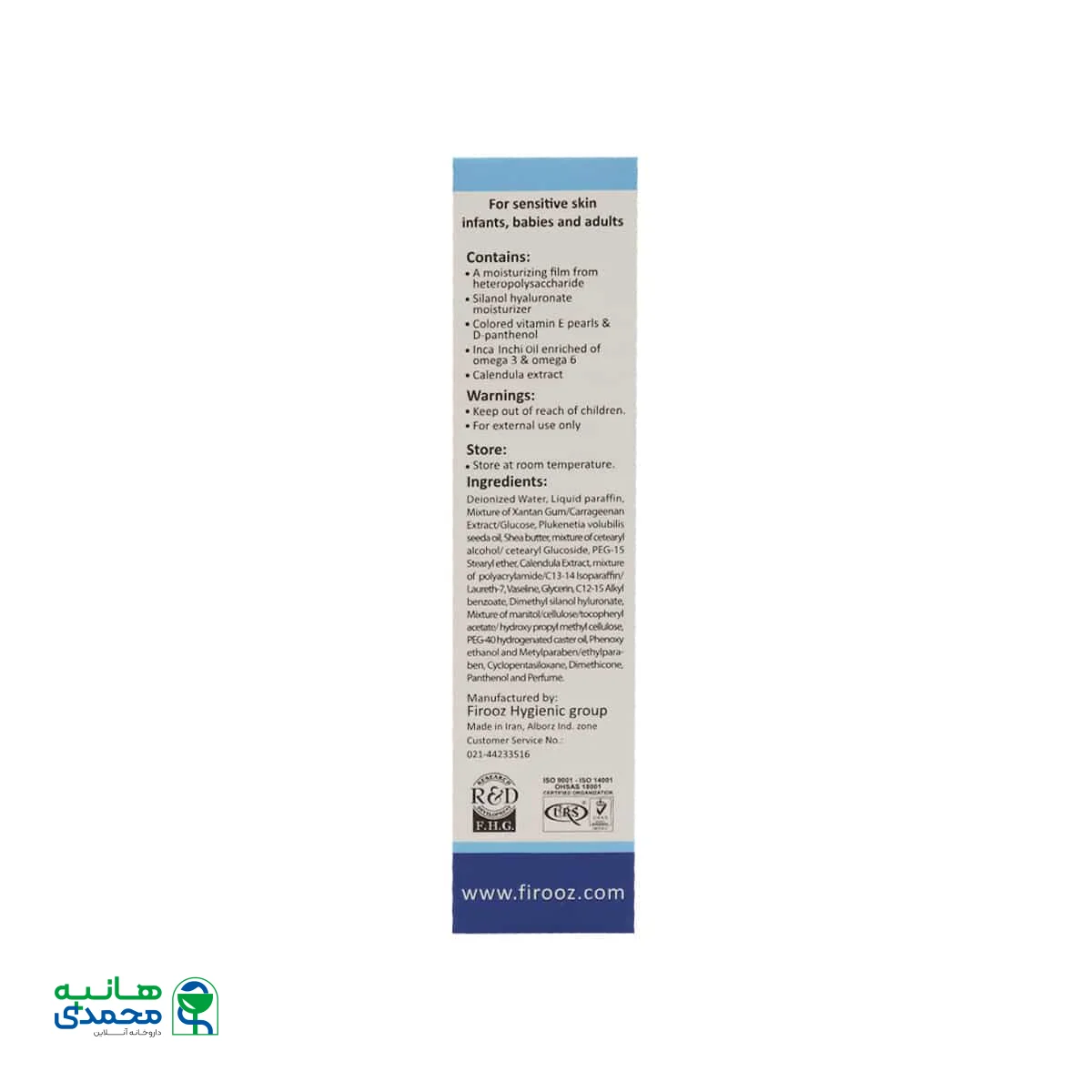 کرم مرطوب کننده فیروز حاوی دانه های رنگی ویتامین E و د-پانتنول است که از مواد اولیه ملایم و طبیعی و بر پایه امولسیون روغن در آب تولید شده است، موجب نرمی، طراوت و شادابی پوست نوزادان، کودکان و بزرگسالان حتی با پوست های حساس می گردد.