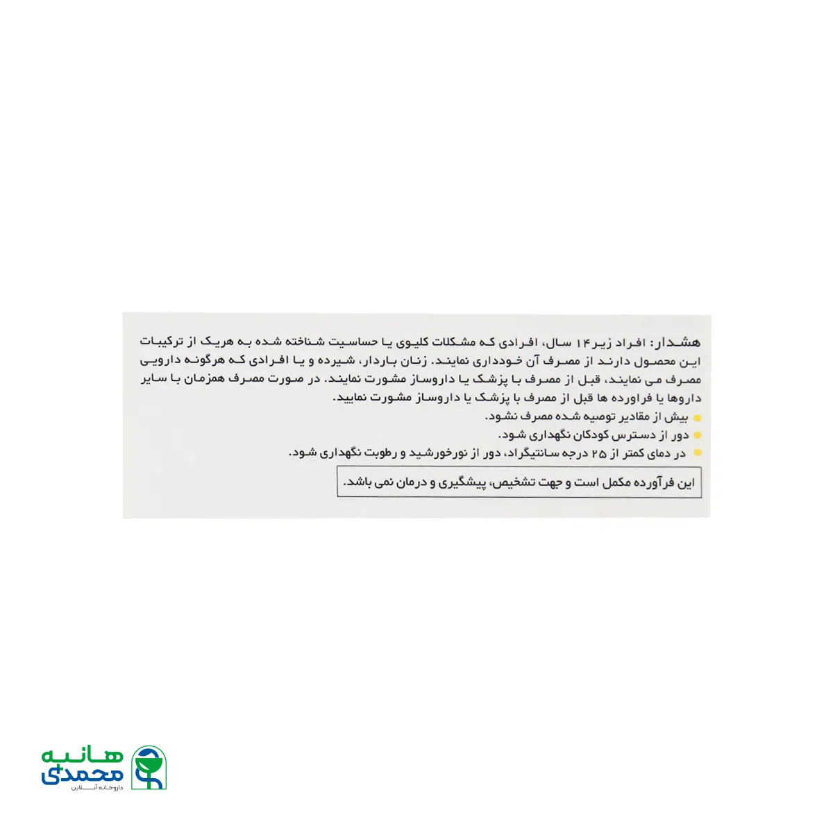 زنان باردار، شیرده و یا افرادی که هر گونه دارویی مصرف می‌نمایند، قبل از مصرف با پزشک یا داروساز مشورت نمایند.