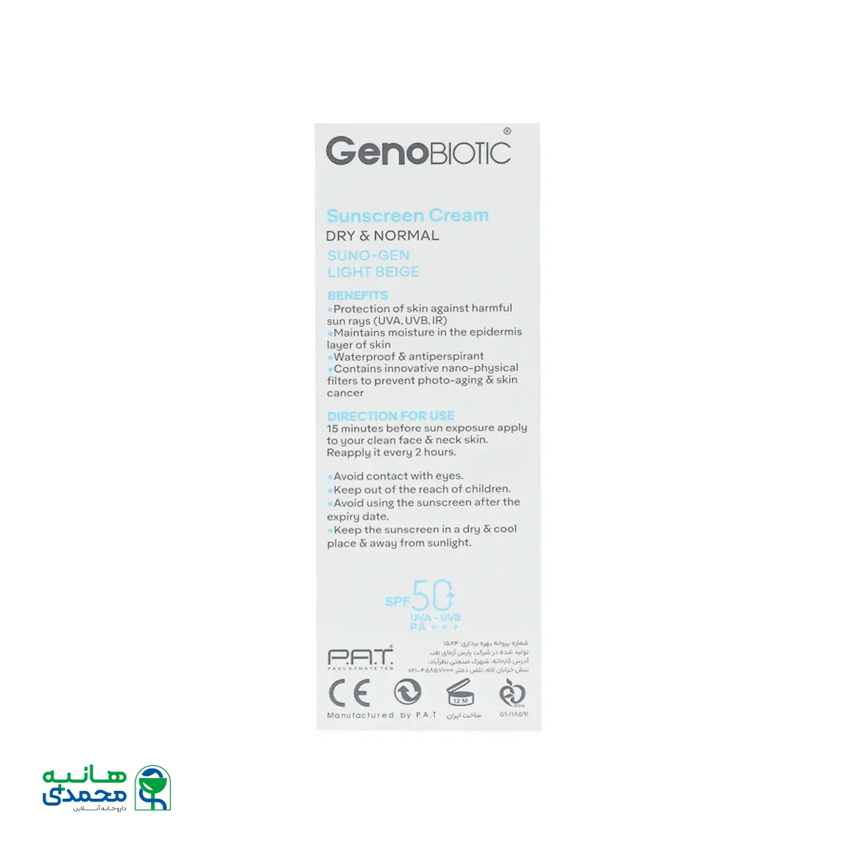 مشخصات کلیGenobiotic SunoGen Sunscreen Cream for Normal and Dry Skin SPF50 50 gr