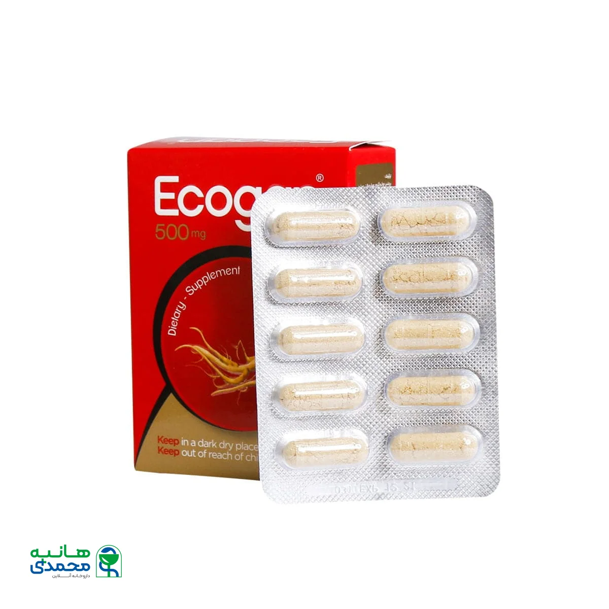 در تهیه کپسول اکوگان عصاره جینسینگ جهت افزایش قوای ذهنی و جسمی و تقویت حافظه استفاده می‌شود که در درمان افسردگی و خستگی‌های مزمن نیز موثر است. همچنین این قرص شامل جوانه گندم است که سرشار از ویتامین‌های B بوده و نقش مهمی در لطافت، درخشندگی و حجیم شدن تارهای مو دارد. در ترکیبات این محصول منیزیم و روی دیده می‌شود که منیزیم باعث افزایش فشار خون شده و از پوکی استخوان جلوگیری می‌کند. افزایش رشد مو و ناخن و همچنین محافظت از سلول‌ها، از جمله فواید روی در بدن است.