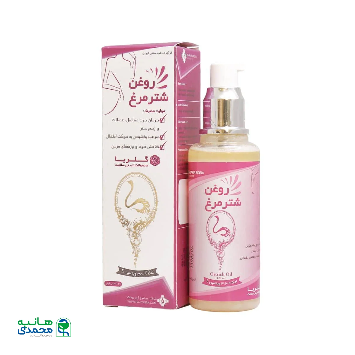 این روغن فاقد وازلین، پارافین و لانولین است و هیچگونه حساسیتی ایجاد نمی کند. اسیدهای چرب غیر اشباع امگا ۳، ۶ و ۹ به حفظ و سلامتی غشای سلولی، مرطوب شدن و ترمیم پوست و همچنین متابولیسم سلولی کمک میکند. روغن شتر مرغ خواص زیادی در ارتباط با زیبایی، دارویی و بهداشتی دارد. این محصول به طور خاص برای درمان درد مفاصل و عضلات فرموله شده است.
