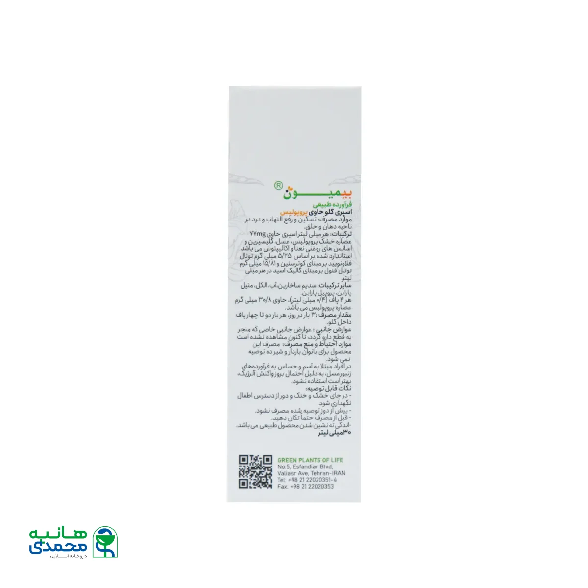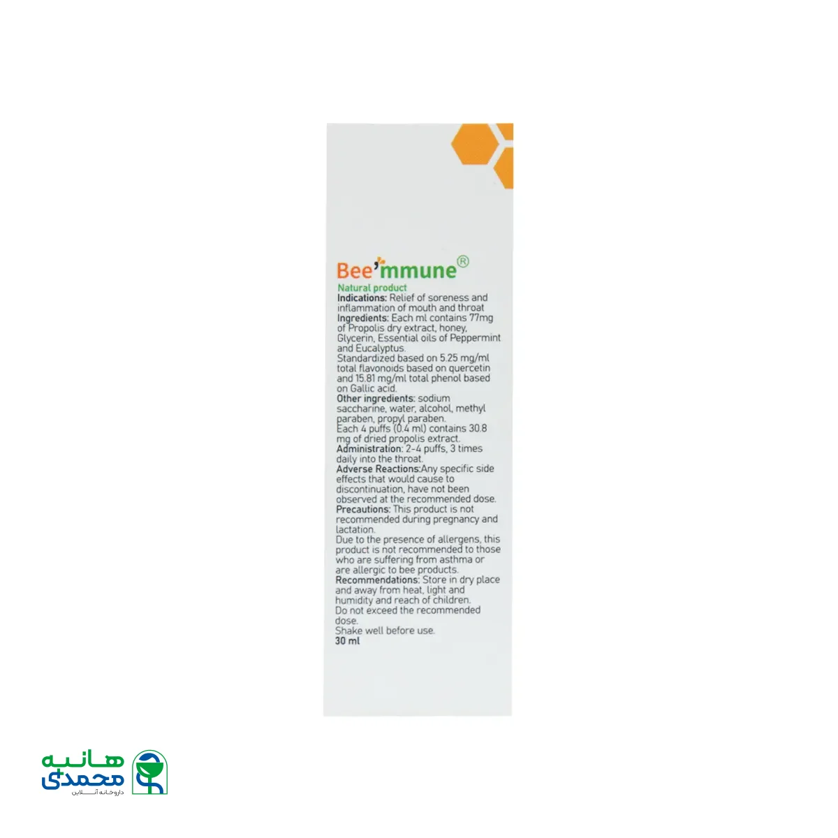 هر میلی لیتر اسپری حاوی 77 میلی گرم عصاره خشک پروپولیس، عسل، گلیسیرین و اسانسهای روغنی نعنا و اکالیپتوس است. استاندارد شده بر اساس 5.25 ملی گرم توتال فلاونویید بر مبنای کوئرستین و 15.81 میلی گرم توتال فنول بر مبنای کالیک اسید در هر میلی لیتر.