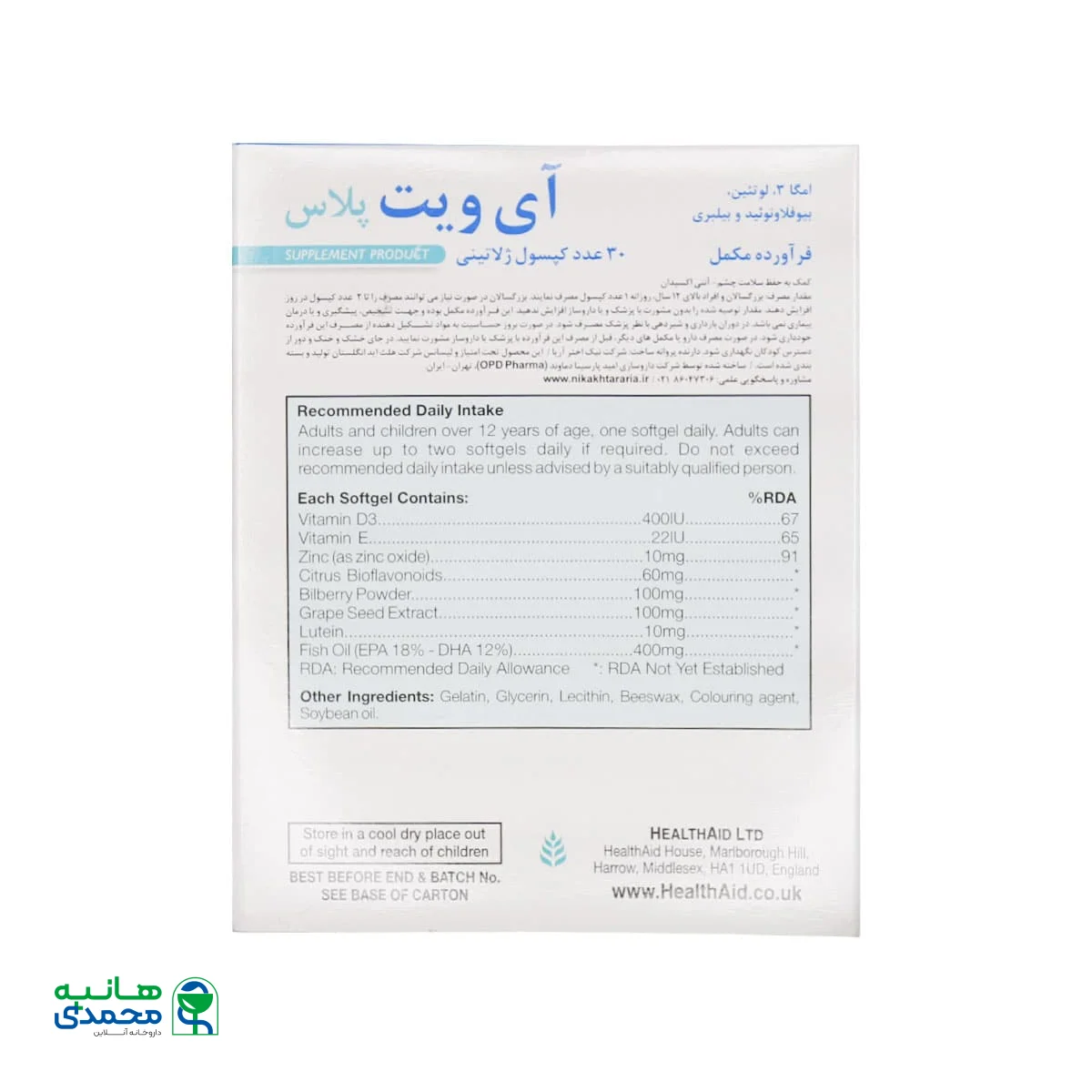 کپسول ژلاتینی آی ویت پلاس هلث اید یک مکمل غذایی برای افزایش سطح سلامت چشم است. این محصول حاوی مقادیر قابل توجهی امگا 3، زینک و ویتامین‌های D3 و E است. امگا 3 موجود در این محصول از خشک شدن چشم‌ها جلوگیری می‌کند، عملکرد غدد میبومین را بهبود بخشیده و التهابات چشم را کاهش می‌دهد. زینک نیز باعث تقویت دید در شب شده و علائم بیماری آب مروارید را کاهش می‌دهد. محافظت از چشم در برابر رادیکال‌های آزاد، جلوگیری از ابتلا به آب مروارید و تقویت چشم از جمله فواید ویتامین E موجود در این کپسول است. کپسول ژلاتینی آی ویت پلاس هلث اید به سبب ترکیبات مغذی خود از مویرگ‌های شبکیه محافظت می‌کند، مانع از تبخیر اشک موجود در چشم شده و علائم خشکی چشم را کاهش می‌دهد. برای خرید مکمل های برند هلث اید می‌توانید به سایت داروخانه آنلاین دکتر هانیه محمدی مراجعه نمایید.