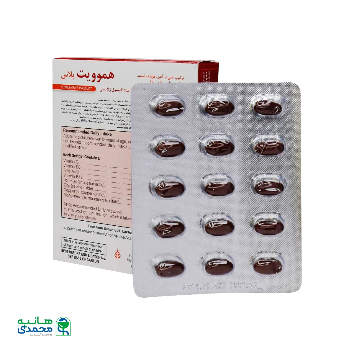 کپسول هموویت پلاس هلث اید ترکیب غنی از اهن، ویتامین B6، B12، C، اسید فولیک (B9)، روی، مس و منگنز برای کمک به تقویت سیستم ایمنی و عصبی بدن است. ویتامین های گروه B و اسید فولیک در امر خون سازی موثر بوده، همچنین برای سلامت عمومی تمام افرادی که از فقر آهن رنج می برند، زنان باردار (با مشورت پزشک) و افراد دارای اختلالات عصبی، قلبی و عروقی مناسب است. کپسول هموویت پلاس هلث اید دارای 30 عدد کپسول ژلاتینی نرم (2 بلیستر 15 عددی) است، که در یک جعبه مقوایی بسته بندی شده است.