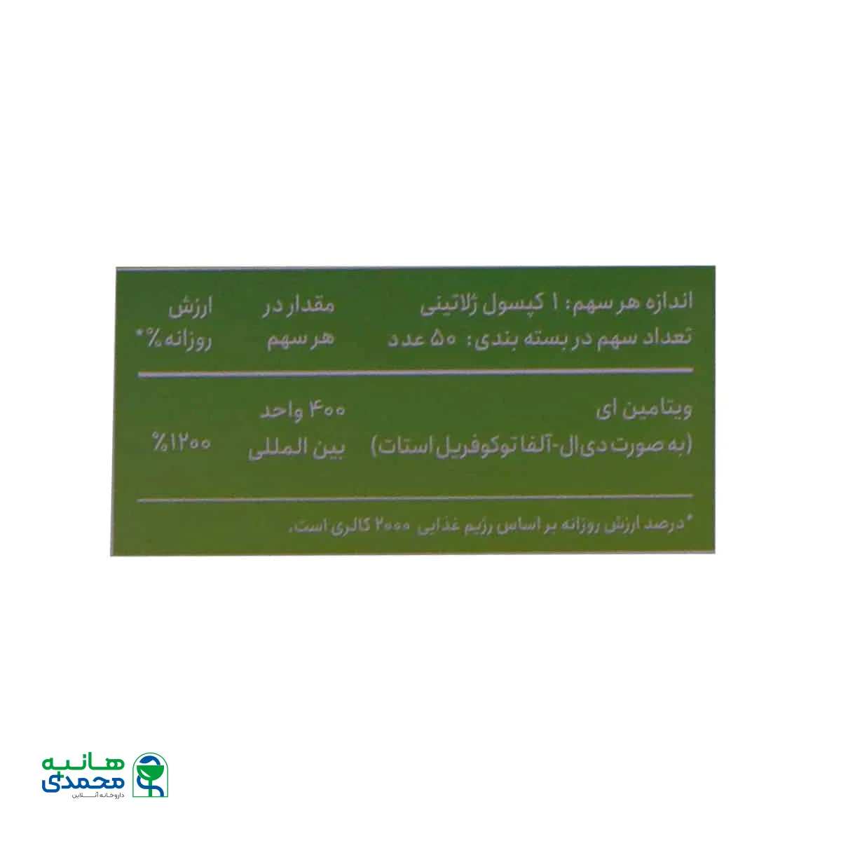 ویتامین ای (به صورت دی ال-آلفا توکوفریل استات) 400 واحد بین المللی 1200%