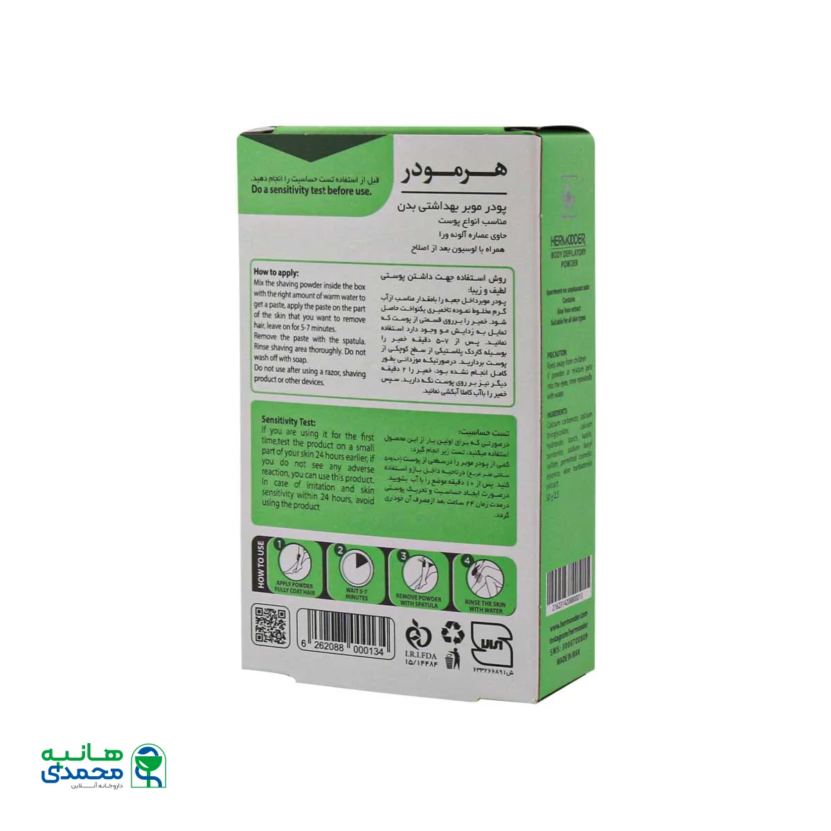 ابتدا باید مقدارکافی از پودر موبر آلوئه ورا هرمودر را با مقدار متناسب از آب مخوط کرده تا خمیری یکنواخت حاصل شود. خمیر را به ناحیه مو دار که خشک وتمیز باشد مالید. (ناحیه باید خشک و تمیز باشد. اگر ناحیه مو دار در اثر تعریق خیس بوده و یا از قبل آغشته به کرم یا روغن باشد، پودر موبر به خوبی عمل نخواهدکرد.)