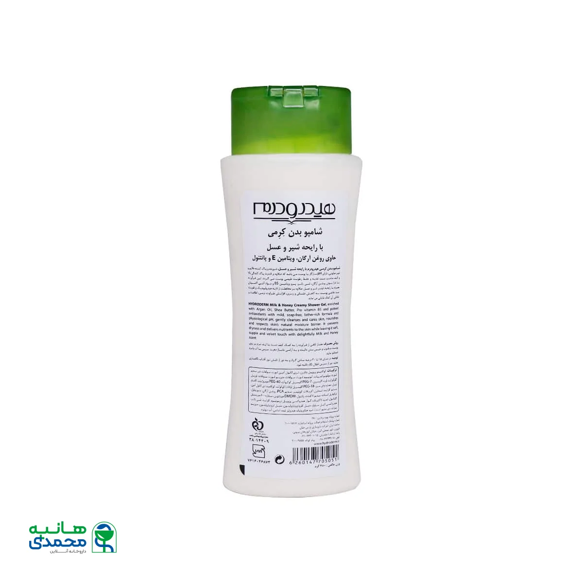شامپو بدن کرمی با رایجه شیر و عسل هیدرودرم ساخت کشور ایران است. این شامپو بدن با رایحه دلپذیر و ملایم شیر و عسلی که در خود دارد مانند عطر به صورت طولانی مدت بر روی پوست بدن باقی می‌ماند و از این رو طرفداران بسیار زیادی را به سمت خود کشانده است. این محصول دارای PH متناسب با پوست بدن است و بعد از استفاده هیچ حساسیتی ایجاد نکرده و استفاده از آن برای انواع پوست مناسب است. این شوینده ملایم به راحتی تمامی آلودگی‌ها را از روی پوست شما پاکسازی می‌کند.